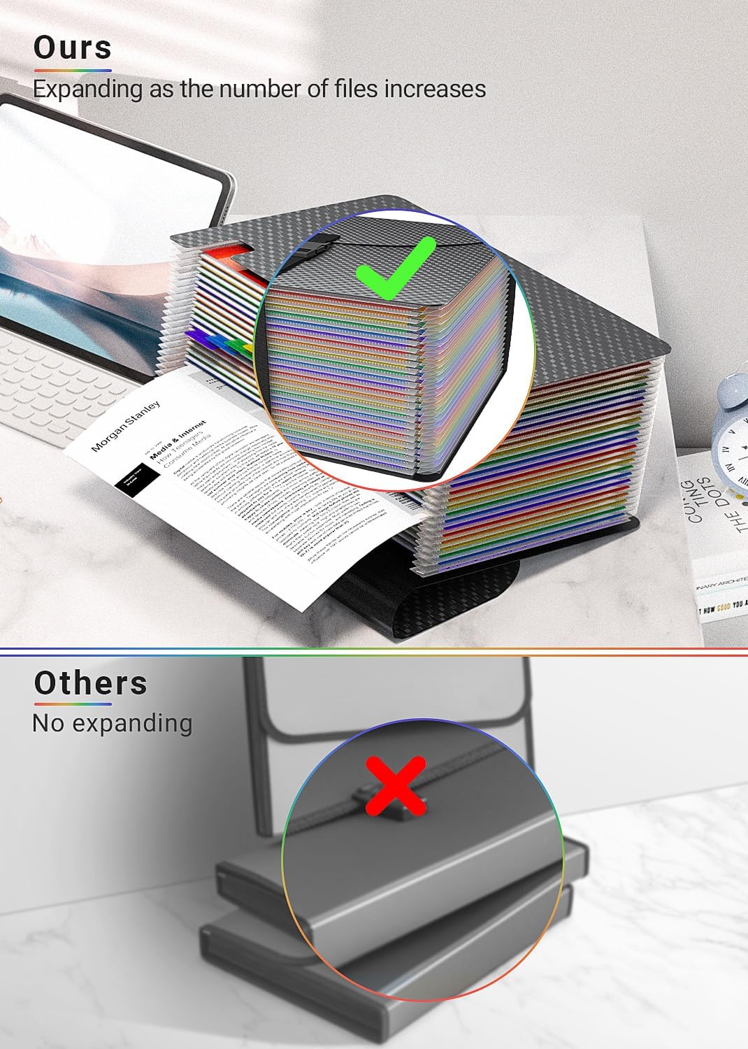 - ✔【ADVANTAGE】The lid of file folder organizer is designed with an extension line. The interior of file folders can be fully expanded and adjusted to the perfect position at will as more and more files are put in. It's definitely a useful and fashionable expanding file folders.