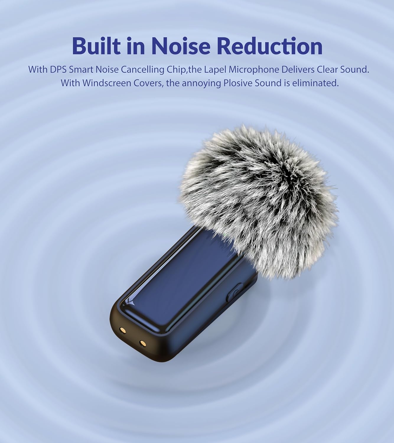 - Crystal Clear Sound: This wireless lavalier microphone is built with DPS chips to reduce unpleasant background noise and effective windscreen cover to avoid plosives, so the recording sound is crisp. The omnidirectional lapel mic pick up sound from all around while blocking out ambient screech and noise, thus ensuring stereo, vivid and euphonic sound.