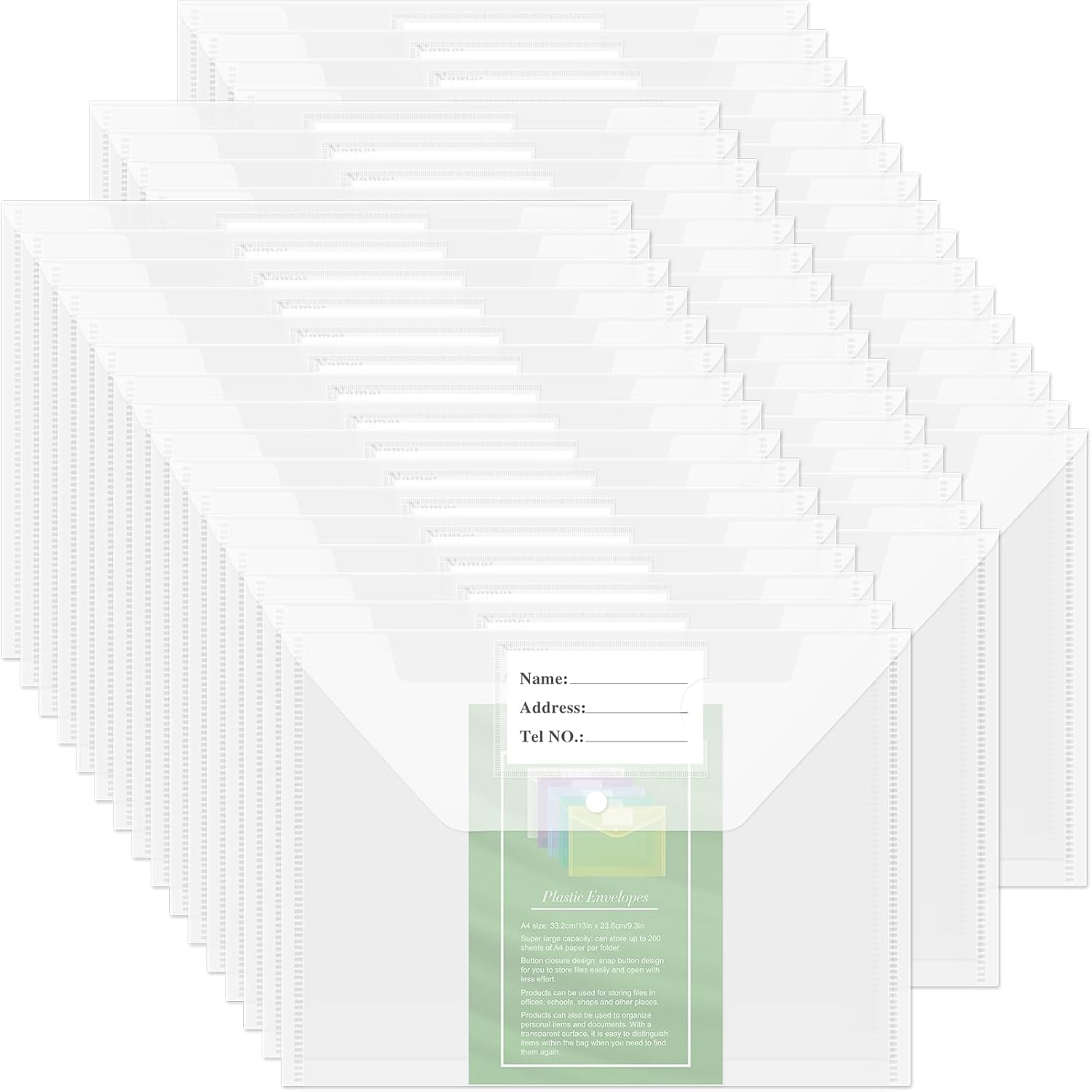 NACHLYNN 48pcs Plastic Envelopes Plastic Folders with Snap Closure, A4 Size Clear File Envelopes with Label Documents Folders Organizers for Home Work Office Organization