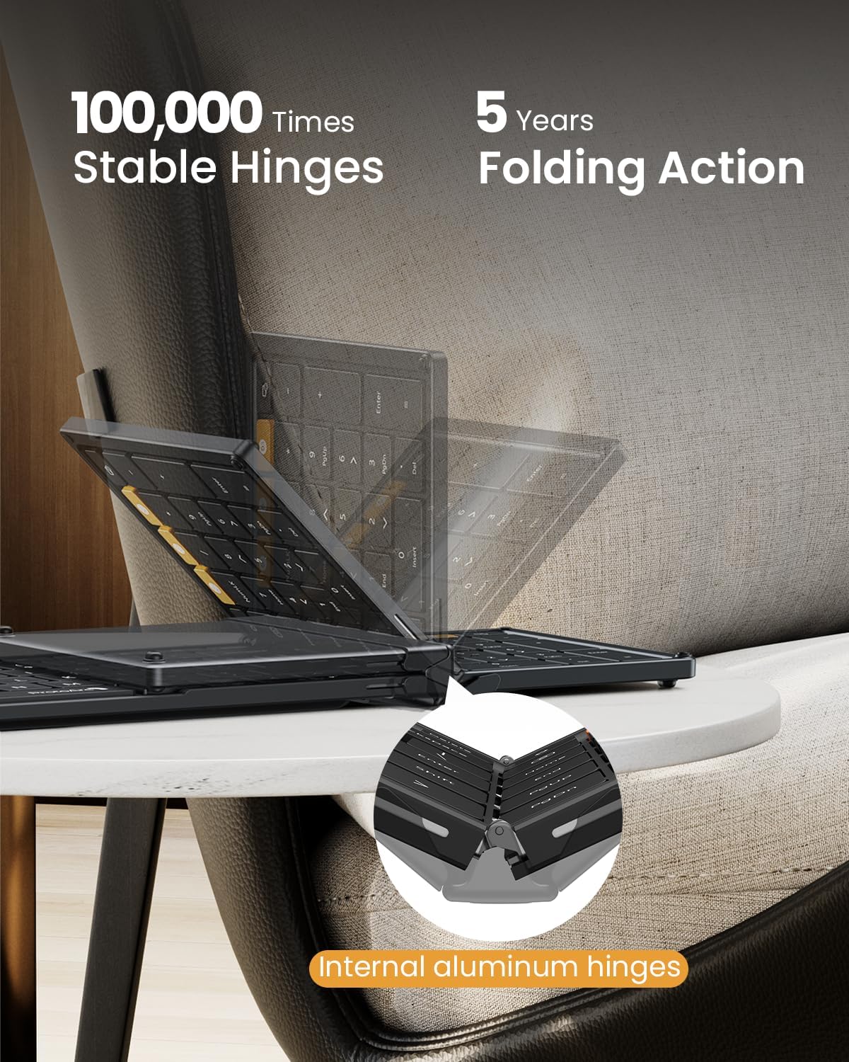 - Full-Size Productivity On The Go: A 105-key folding keyboard delivers a true desktop experience with dedicated function/number pads—ideal for spreadsheets, coding, or data entry anywhere. Designed for frequent travelers, its ultra-slim profile and flat typing surface (no tilt) enable effortless portability, while the simple fold-and-go mechanism (no locking clips) ensures quick deployment