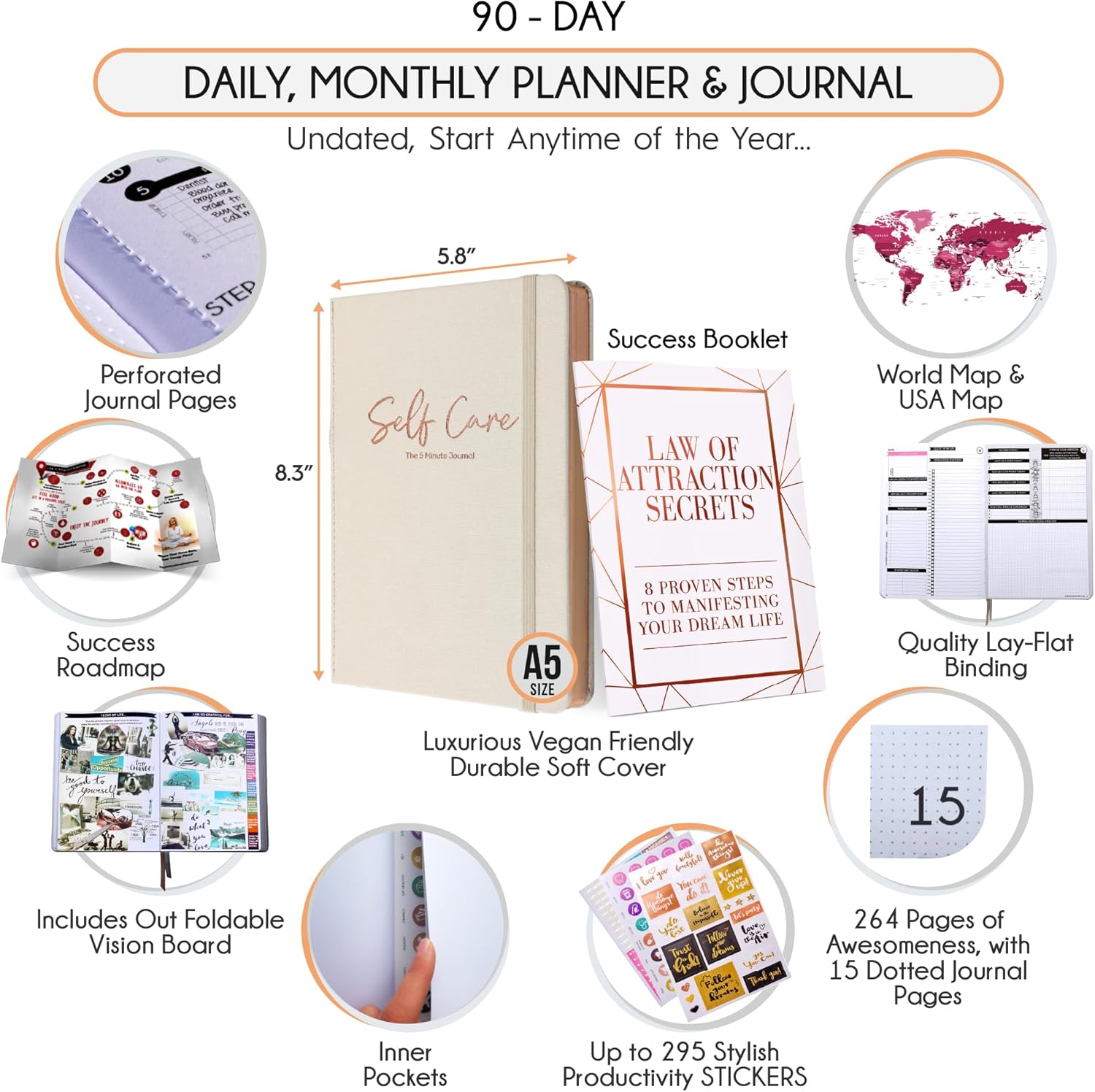 - SELF-CARE JOURNAL - This deluxe daily planner and gratitude journal comes in A5 size (5.8 x 8.3 inches). The life planner comprises 264 pages of thick 100 gsm paper, including 90 daily planning sheets, guiding you on how to become the best possible version of yourself on a mental, physical, and interpersonal level. It's a unique diary based on leading scientific studies proven to increase productivity and happiness. The journal features an out-foldable vision board to help you stay focused, morning and evening power questions, mind maps, reflection pages, habit trackers, a back pocket, and much more than any other planner on the market!