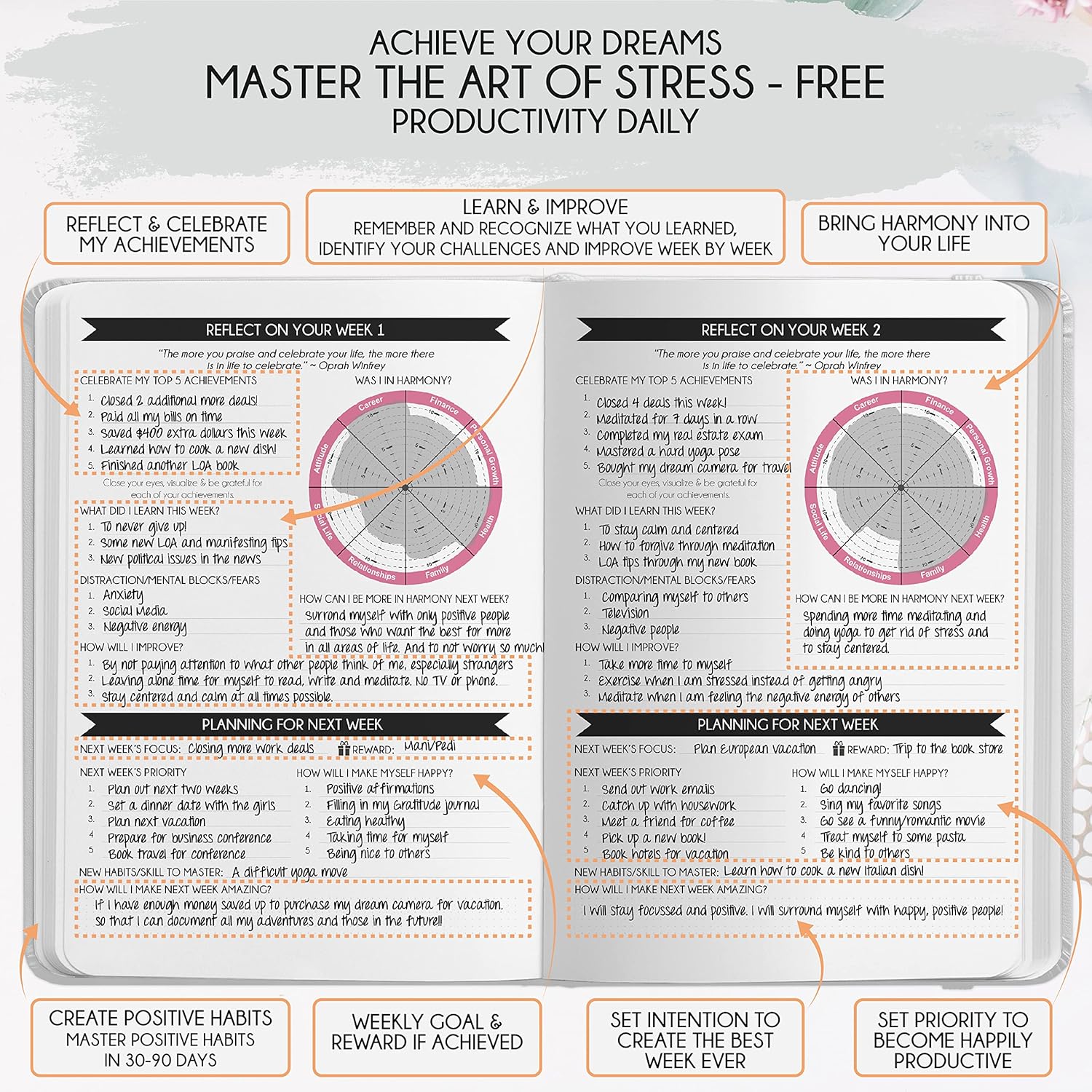- LUXURIOUS AND TOP QUALITY - Self-care journal for women and men, perfect for entrepreneurs, professionals, college students and everyone who has burning desire to turn dreams into reality! FREE VIDEO MINI-COURSE: You will learn 10-min morning routine used by the most successful people to 10-fold your productivity, focus, happiness & passion! You will master setting goals & fix procrastination!
