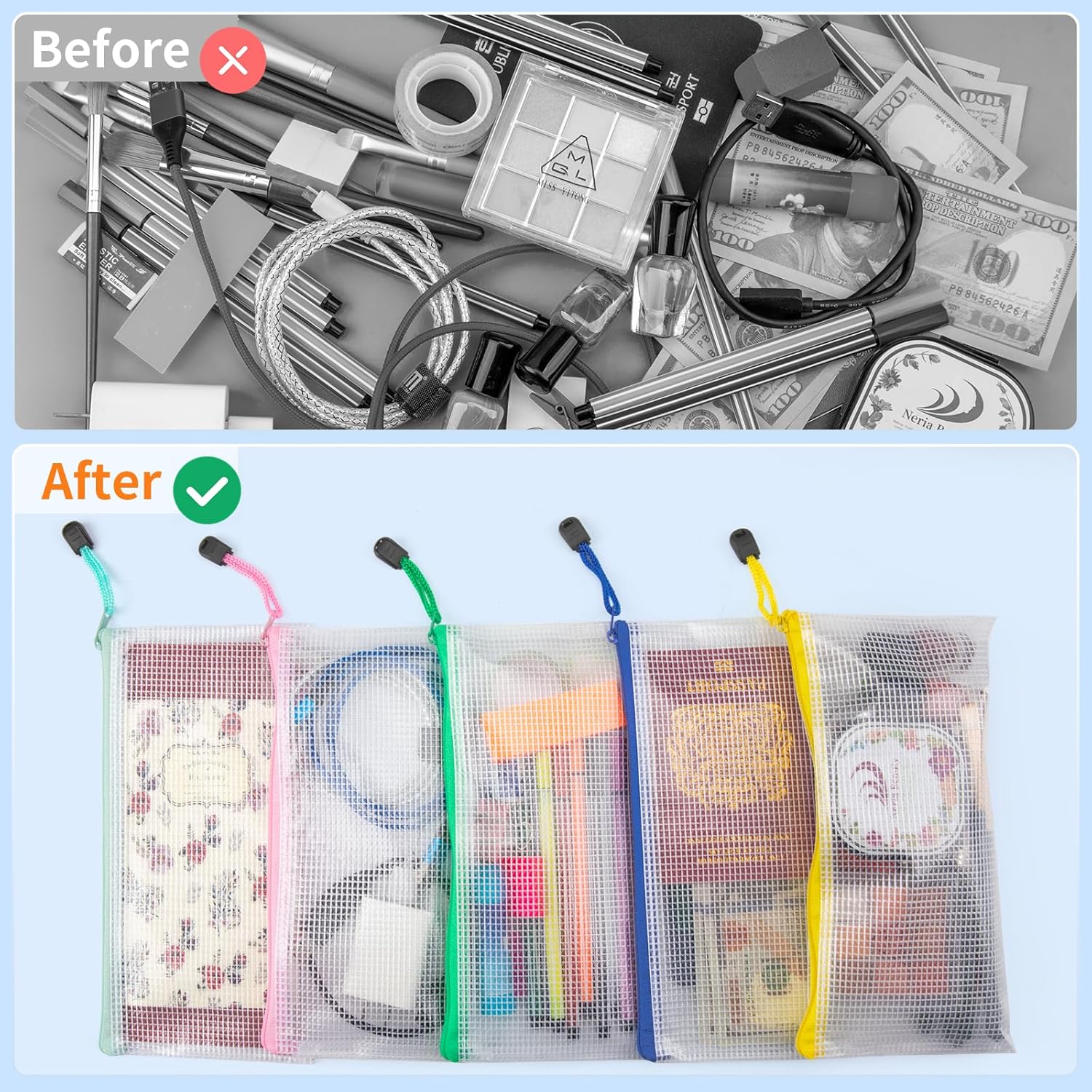 - 【16 Bright Colors】 - Package includes 16pcs mesh bags in 16 different colors, Different colors for better sorting your items. Each zipper is equipped with a rope loop, which is strong and durable. It can be used as a hanging ring and ready to hang