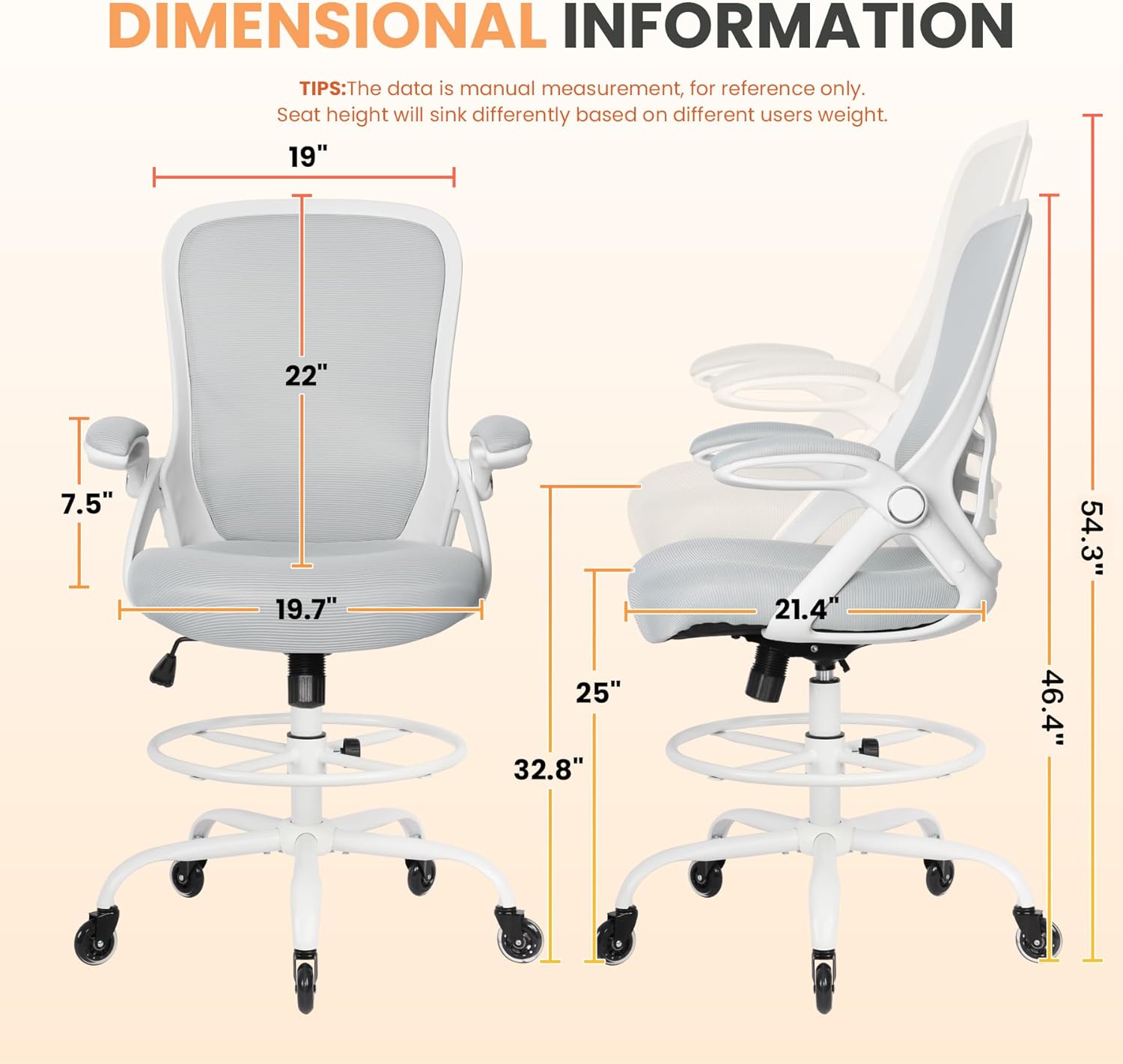 - ERGONOMIC DRAFTING CHAIR: Ergonomically designed backrest and prominent lumbar support fit the natural curve of the spine, and keeps you in a good seating posture. Flip-up armrests could be folded up while not in use, makes it space-saving for limited rooms. Adjustable seat height and foot-ring makes this tall desk chair ideal for higher office desks, bar-height tables, drawing rooms, and standing desks.