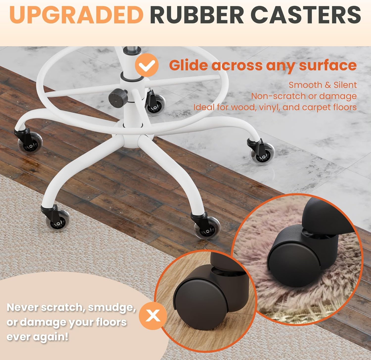- UPGRADED RUBBER WHEELS: To accommodate different users needs, our high office chairs choose expensive but high quality rubber wheels. These rubber casters are friendly to any types of floors, and never scratch, damage or smudge your wood, vinyl, or carpet floors. We believe a better office chair is designed for users convenience in every aspects.