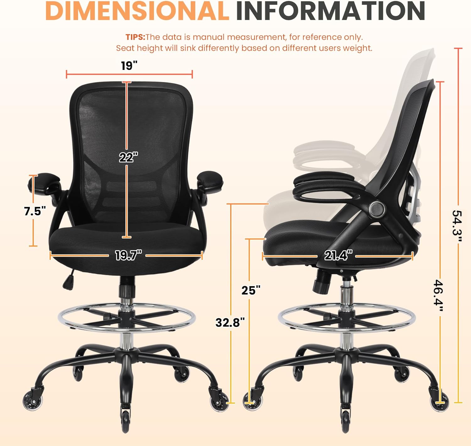 - ERGONOMIC DRAFTING CHAIR: Ergonomically designed backrest and prominent lumbar support fit the natural curve of the spine, and keeps you in a good seating posture. Flip-up armrests could be folded up while not in use, makes it space-saving for limited rooms. Adjustable seat height and foot-ring makes this tall desk chair ideal for higher office desks, bar-height tables, drawing rooms, and standing desks.