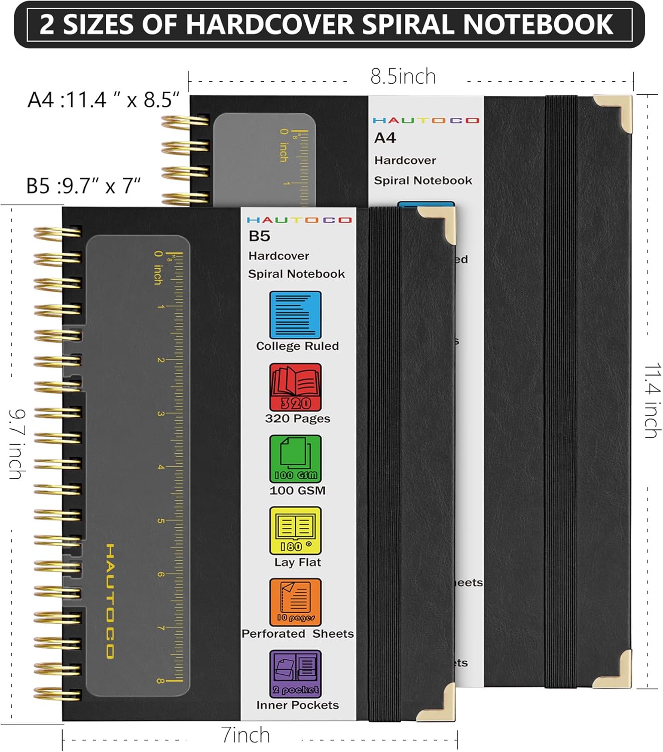 HAUTOCO Spiral Notebook College Ruled B5 Leather Bound Journal, 320 Pages, Hardcover Notebooks with tabs, 100 GSM Paper, 7"x 9.7" Lined Journaling Notebooks for Work Office School Business, Black