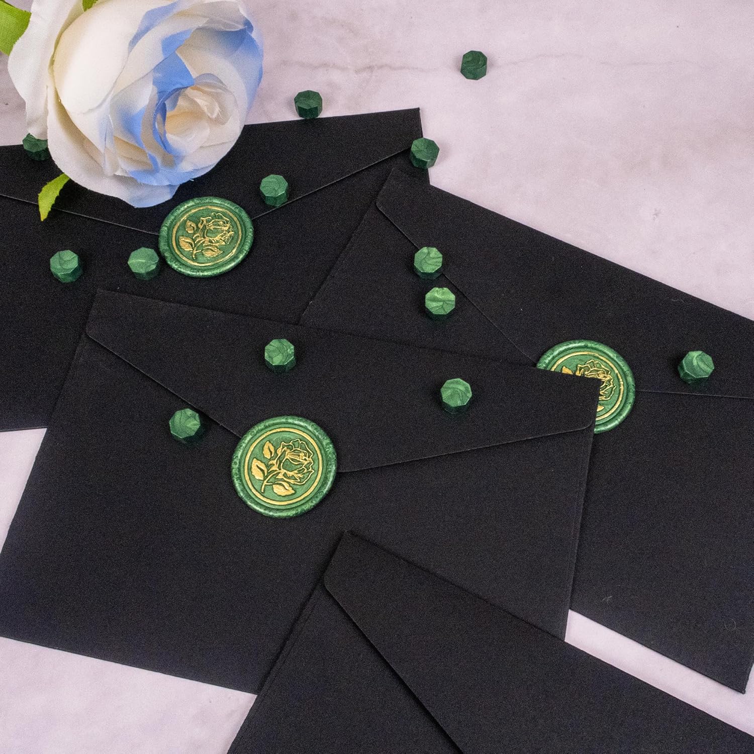 100Pcs Gold & Green Wax Seal Stickers - Handmade Envelope Seals, Self-Adhesive Wax Stickers for Wedding Party Invitations, Envelope, Gift Wrap, Christmas (Gold Rose Style, Green)