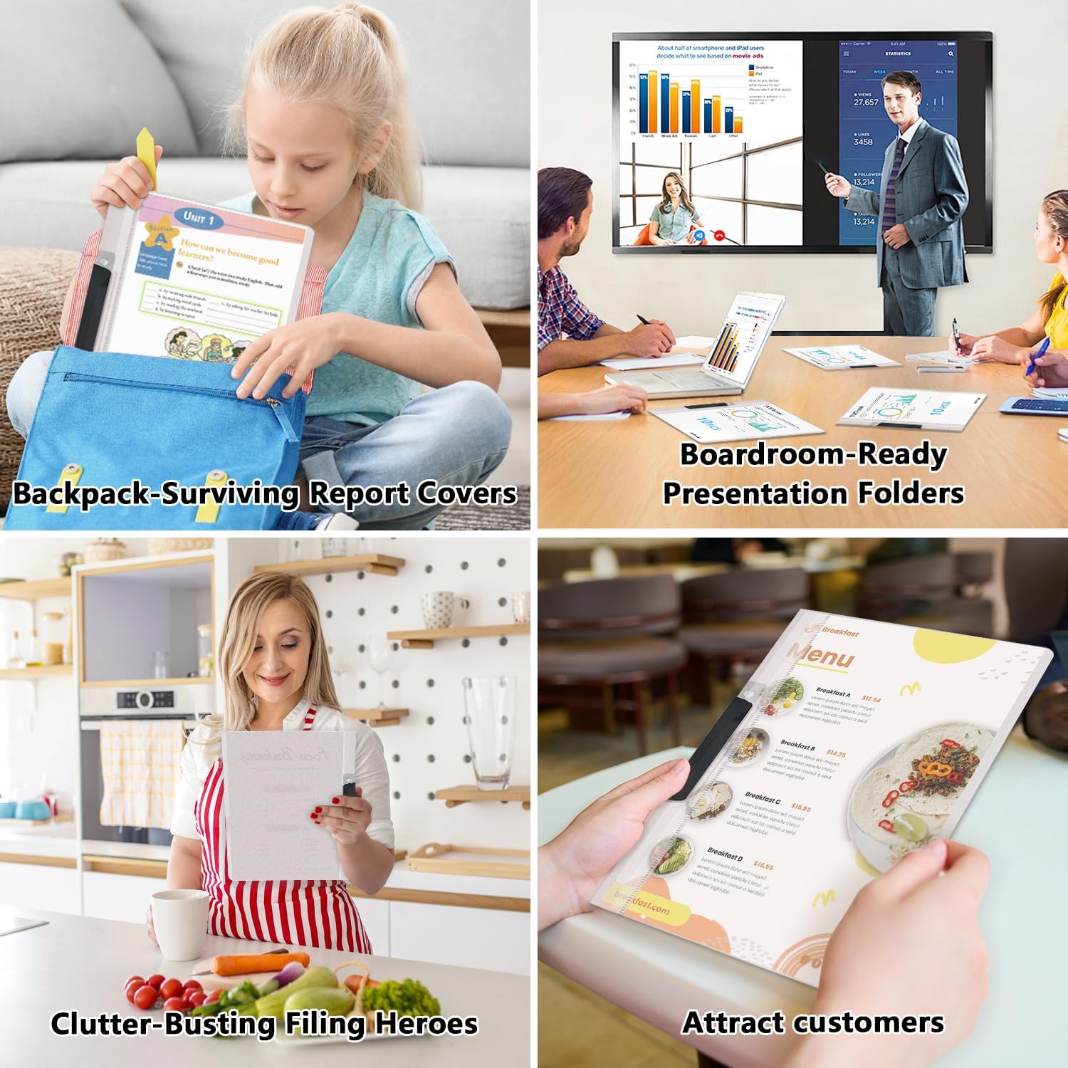 - Multi-purpose folder:Deployed in schools, corporate offices, medical facilities, homes, and retail spaces – these versatile folders streamline workflows by organizing reports for quick access, cut clutter as home filing heroes, and even shine as travel agency brochure holders or diner menu covers. One solution, infinite possibilities.