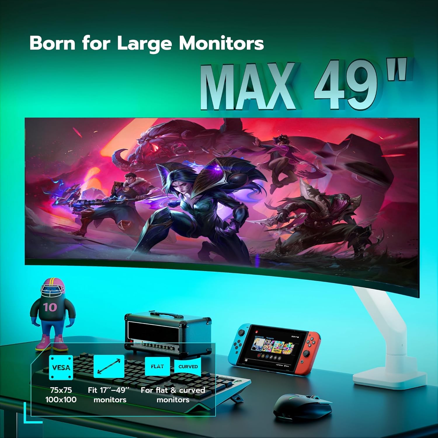 - 【Support up to 49" & 44lbs Monitors】The monitor desk mount supports most flat, and curved computer screens ranging from 17 to 49 inches, holding 4.4 to 44 lbs. Compatible with Samsung Odyssey G9, LG, and other 49" ultrawide monitors which with VESA mount adapter and equipped with 75x75mm and 100x100mm VESA mounting holes.