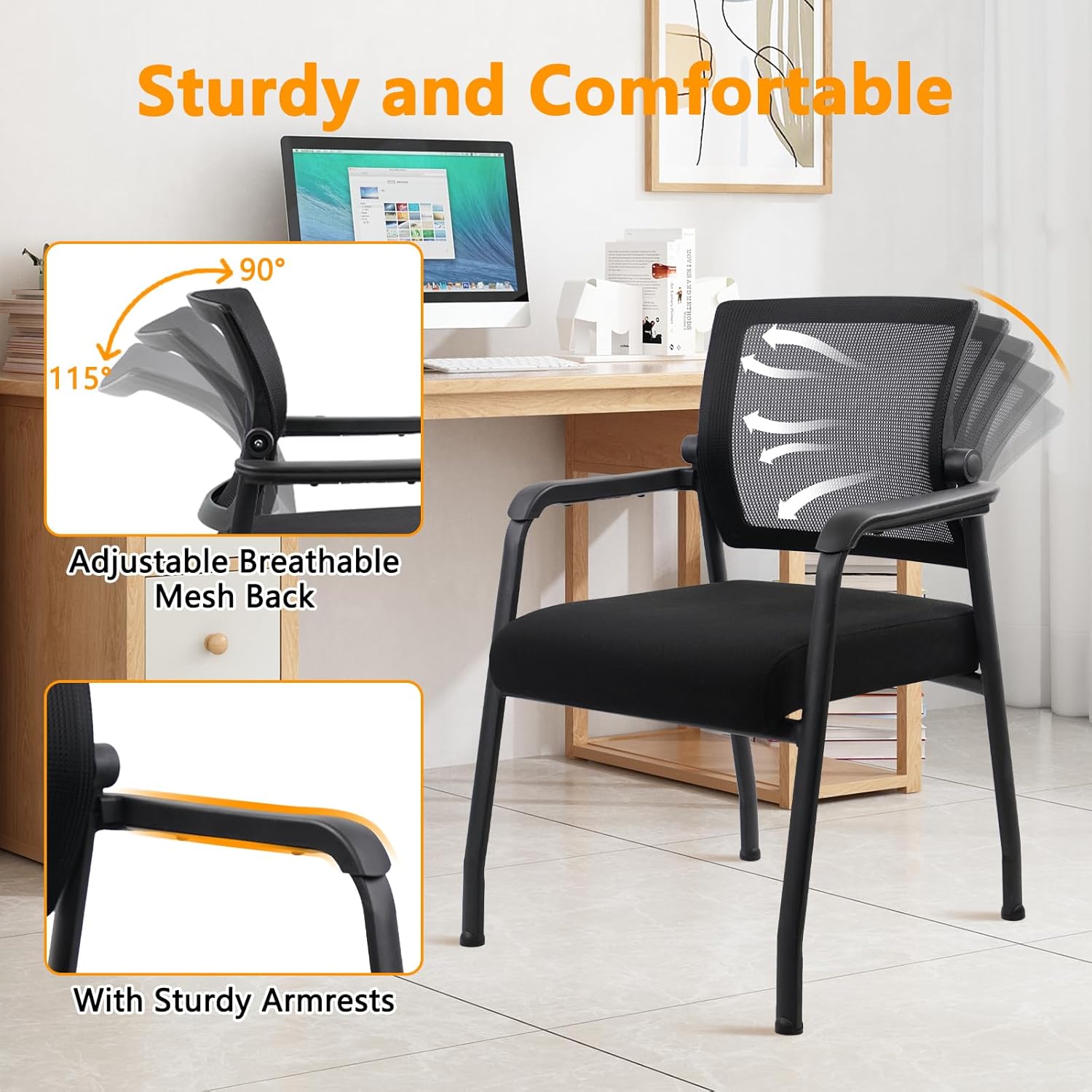 - ăALL DAY COMFORTă: Office guest chair with 2.7â soft and thick foam cushion brings you a comfortable experience; the breathable mesh material of the backrest keeps you from feeling hot and stuffy in summer; the armrest design is easy to move and rest your arms; Moreover, NO wheels office chair design is safe and stable, making it easier for you to engage in work, study or rest.