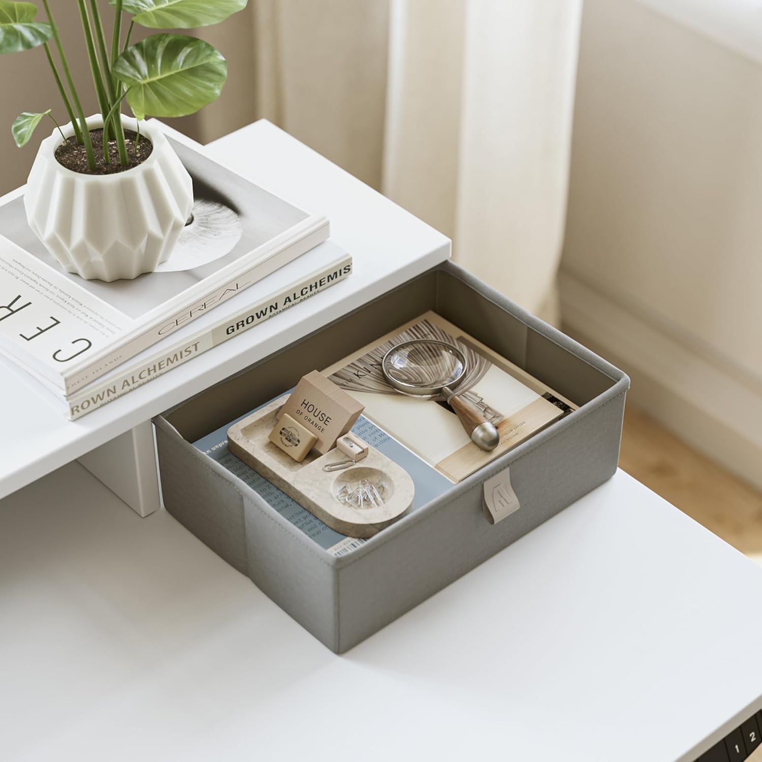- ăPractical fabric drawers] The top shelves with double drawers perfectly collect all office supplies with spacious storage space. Portable fabric design is practical for picking and placing.
