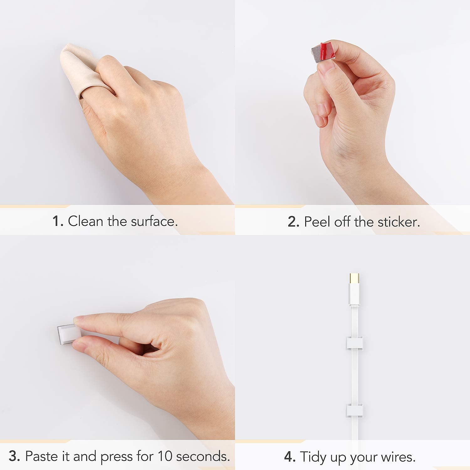 - 【NOTE】 A clean assembly surface is necessary. No dirt, dust, fat or wax. Please do not introduce the cable immediately after the cable clips have been glued to the surface. The double-sided adhesive pad reaches the strongest liability after 24 hours. You can heat the strip with a hair dryer before use
