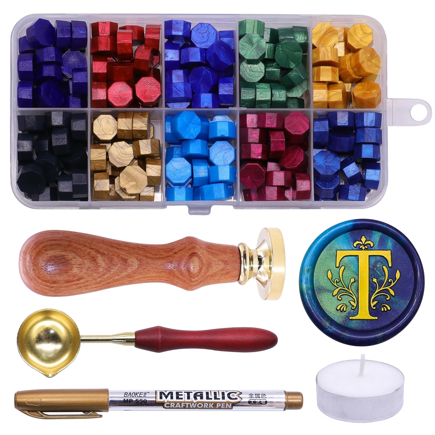 SWANGSA Initial Alphabet T Wax Seal Stamp Kit, Classic Retro Letter Sealing Stamp with 200pcs Sealing Wax Beads Kit for Wedding Invitations Cards Envelopes (T)