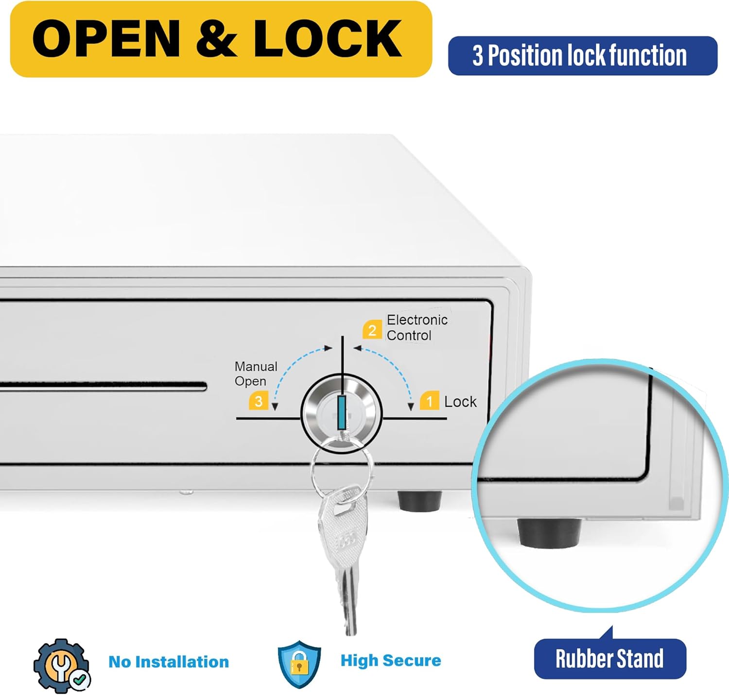 - 💳3-Position Lock& Single Large Front Media Slot: This cash drawer ensures the highest level of security with a 3-position lock mechanism: 1-Lock, 2-Auto Open by Printer/POS, 3-Manual open