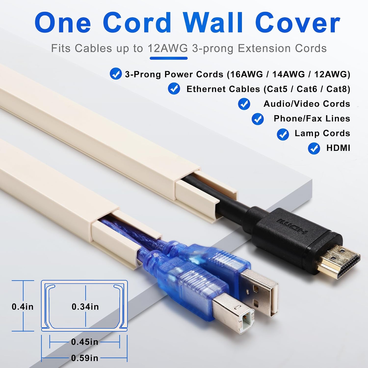 Cord Hider Wall for One Cord, 136in Wire Covers Wall, Easy Install Cable Cover Kit, Cable Raceway Beige, Wire Management Wall, 8X L17in W0.6in H0.4in
