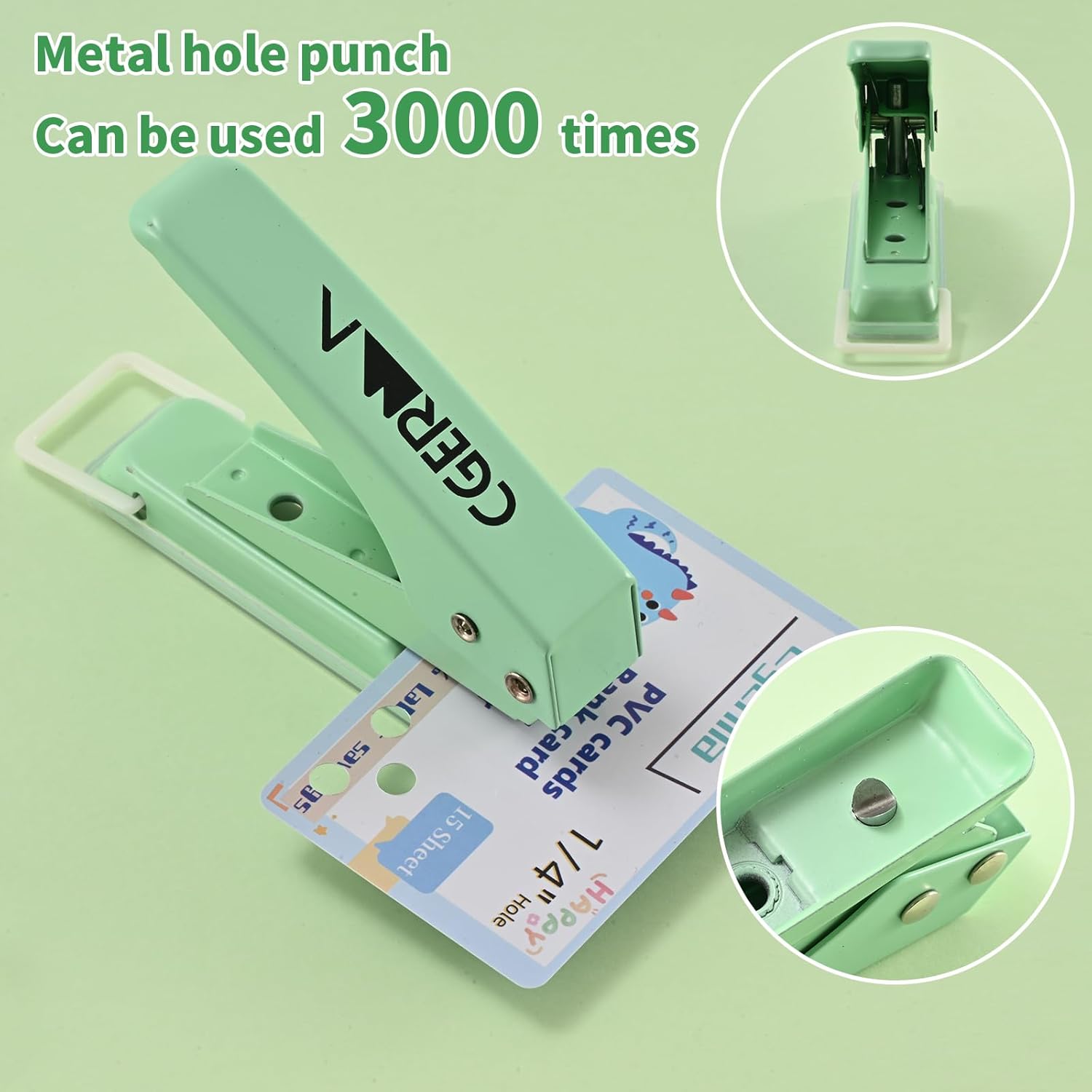Single Hole Puncher, 1/4" Hole, 50% Labor Savings, Heavy Duty Metal Punch, 15 Sheet Capacity, for ID Cards, Chipboard, Art Project, Crafts Easy Punching, Green