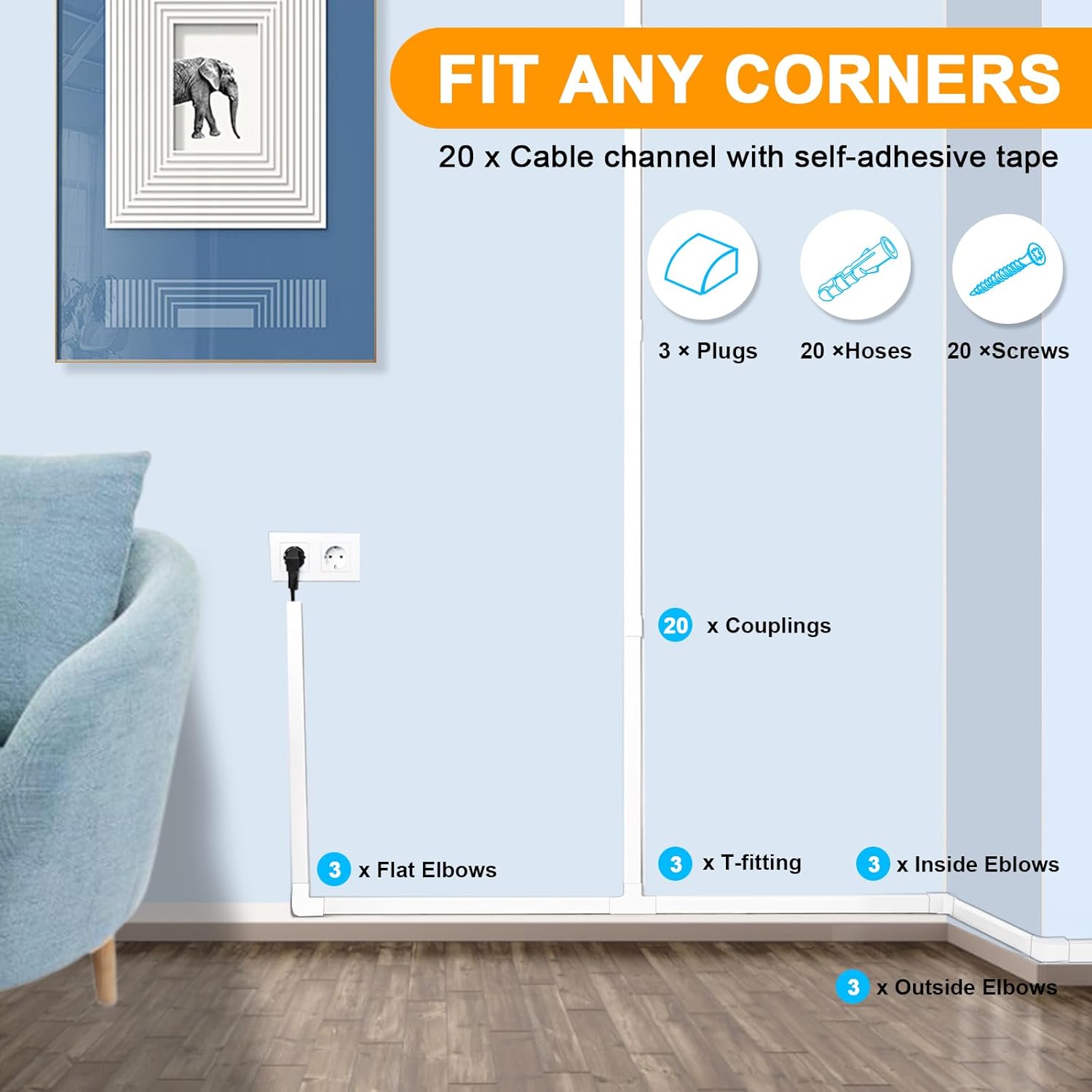 - BOX CONTENT: 20× cable channel with self adhesive tape (15.75"L×0.98"W×0.63"H of each channel, total 315"), 20×couplings, 3×T-Fitting, 3 × flat elbows, 3× inside elbows, 3×outside elbows, 3× plugs, 20× screws, 20× hoses. 1pcs cable raceway can fit around 3-4 cables