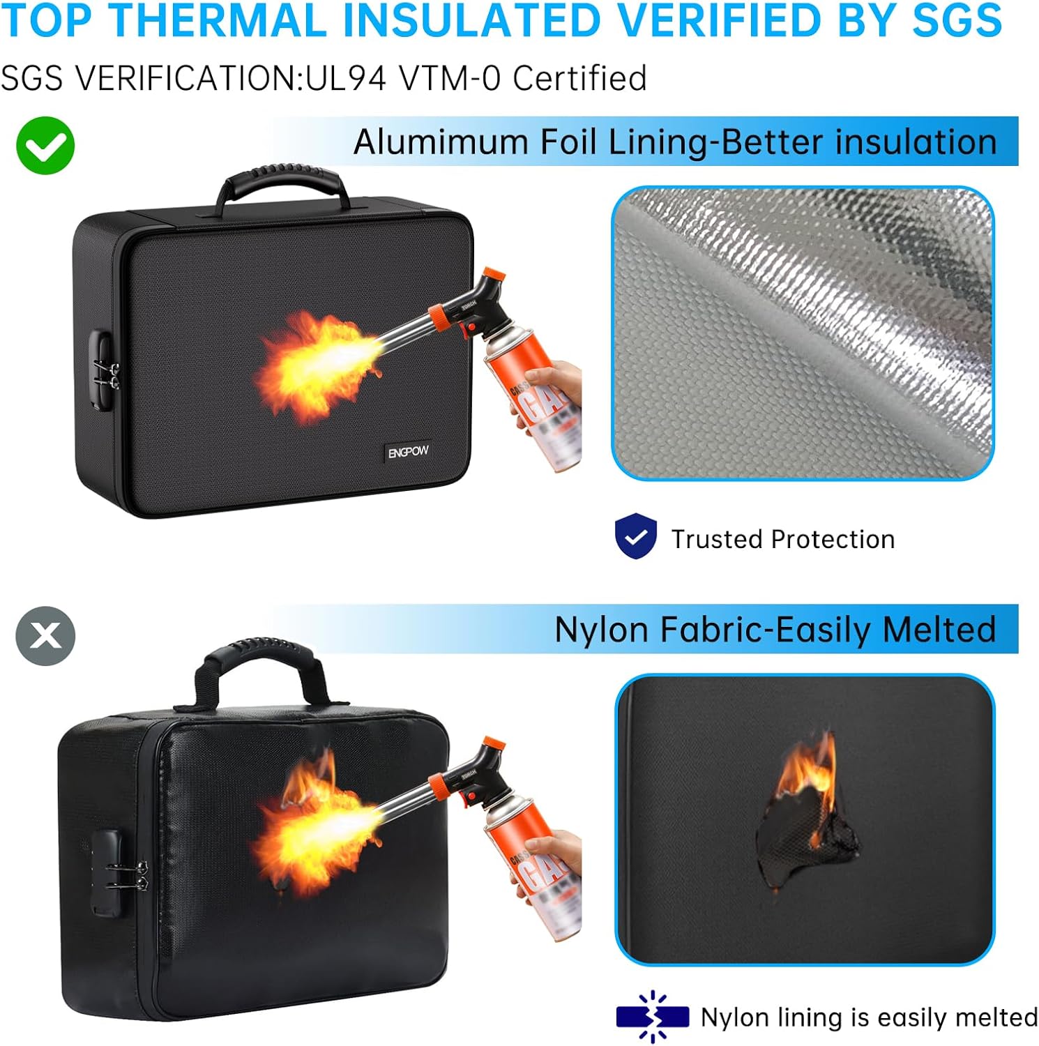- Fireproof and Water-resistant: The multi-Layer file organizer is made of silicone coated material and aluminum foil which withstand the temperature up to 5200℉(double safe protection).Aluminum foil lining isn’t easily melt under high temperature after several tests. It has been passed by SGS TEST(UL94 VTM-0 Certified).The bag is fireproof and Water-resistant, which can effectively protect your important documents in a fire,flood,and wet weather. They will further keep your files intact