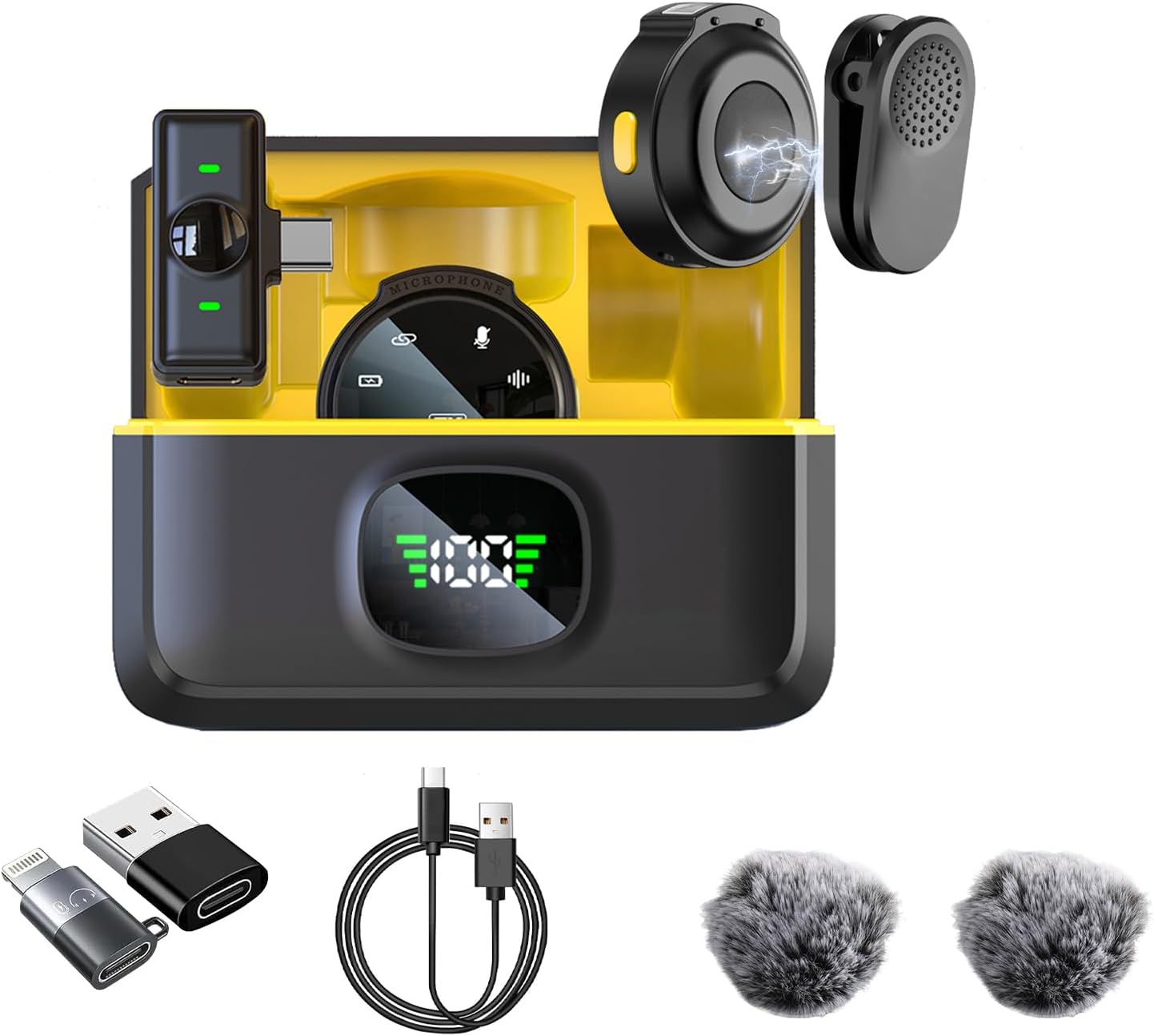 - Included Components : 2 x Transmitter, 1 Receiver, Adapter, Windscreen, Charging Case, cable, Instruction