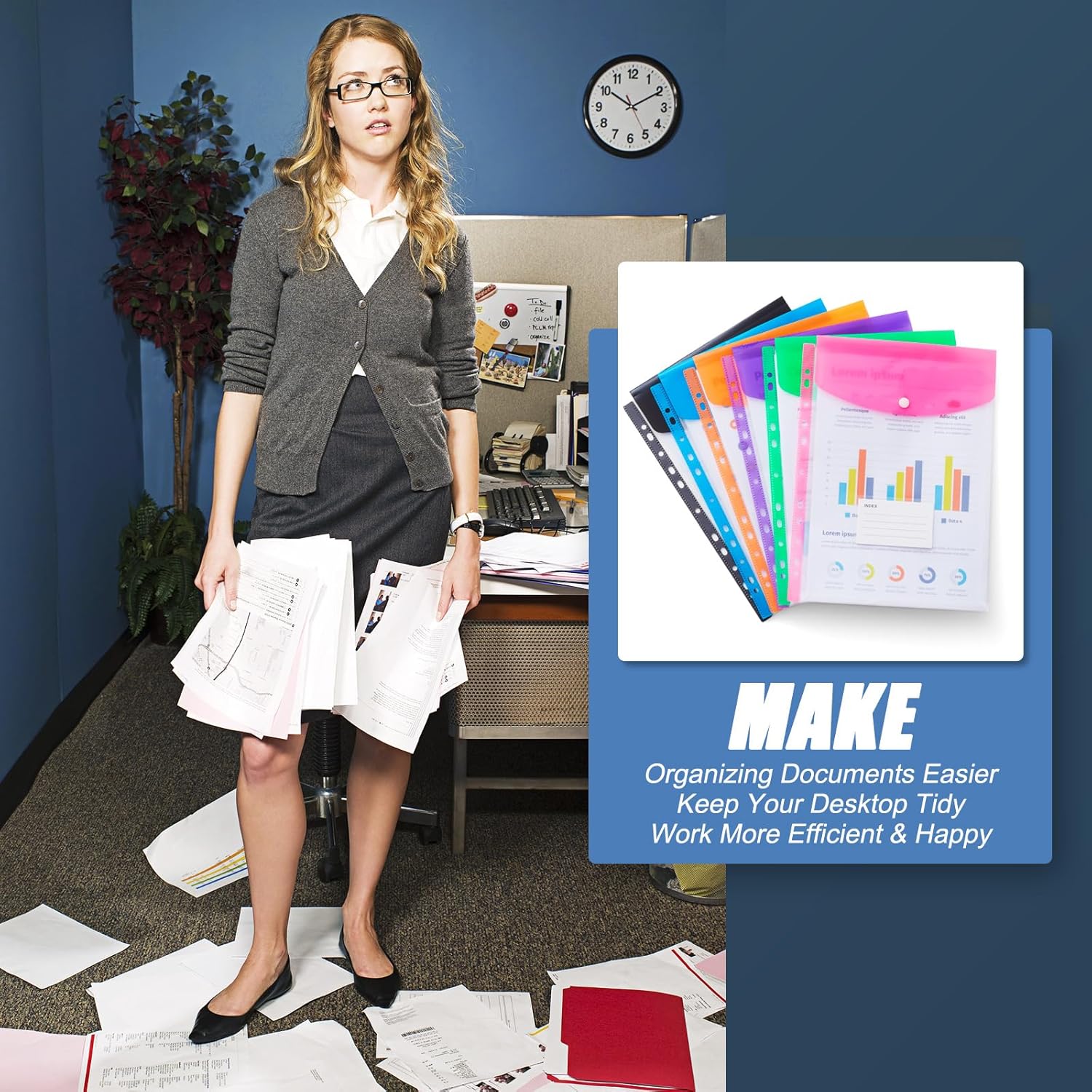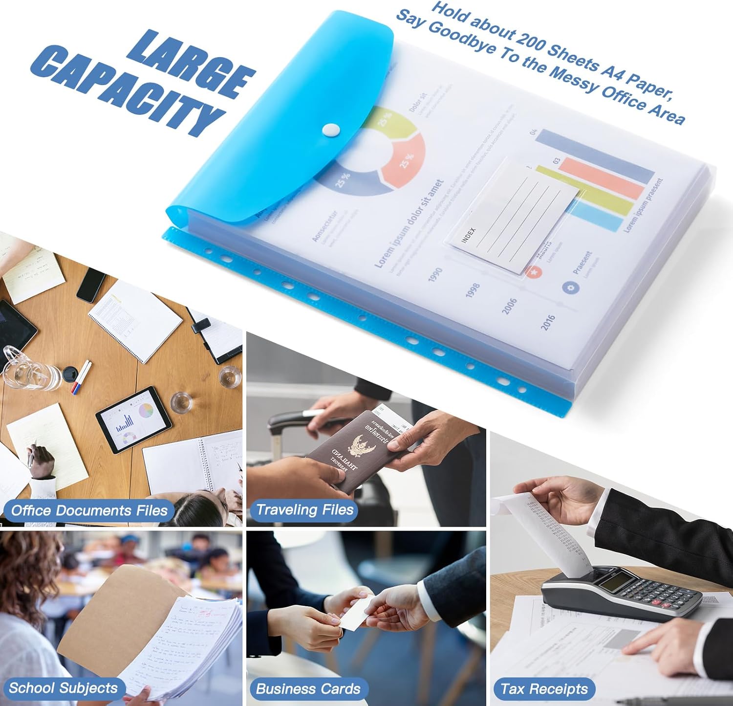 Binder Pocket Organizer Folders, 12 Pack Expandable Files Bag Plastic Envelopes Binder Folders with 11 Holes for 2/3/4 Ring Binder, Document Pouch with Snap Button and Label for School Office Home