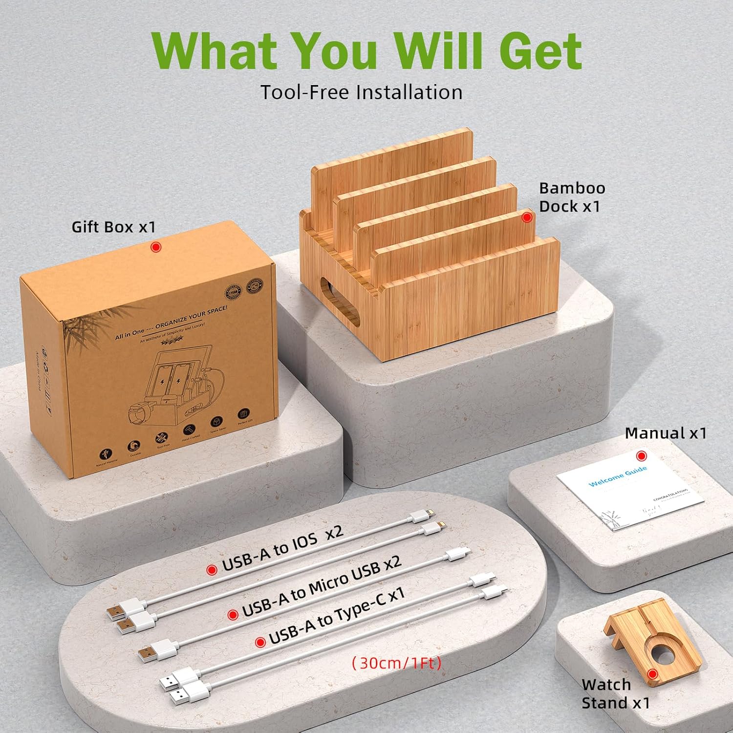 Pezin & Hulin Bamboo Charging Stand, Dock Organizer for Multi Devices, Cell Phone, Tablets, Smart Watch, with Pack 5 Cables, No Power Charger Block