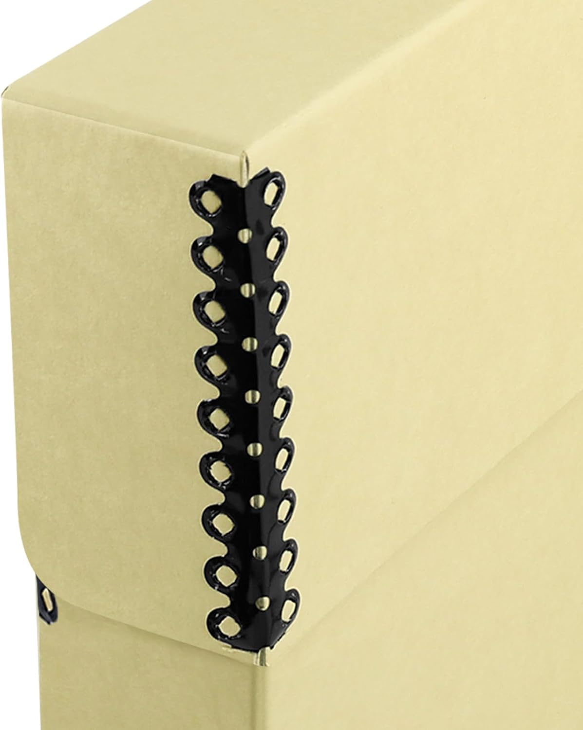 - Legal-sized Box, 15.5" x 10.5" x 2.5" wide, manufactured in the US from Tan 60pt Archival Boxboard with metal edge construction for additional strength