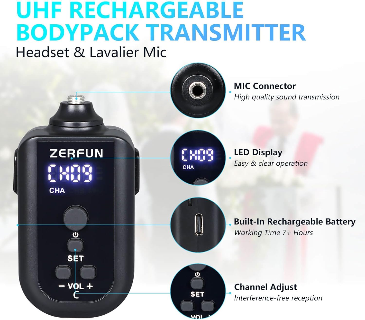 - BATTERY INFO & TRANSMISSION RANGE: Each microphone use built-in rechargeable battery. Microphone Working Time: 10-12 Hours(When full charged). This ZERFUN Wireless Microphone System can support up to 200 feet range, 50 compatible frequencies on each channel(4 X 50) for interference-free reception. The UHF frequencies range within 500 - 599 MHz, are compliant with the FCC regulations.