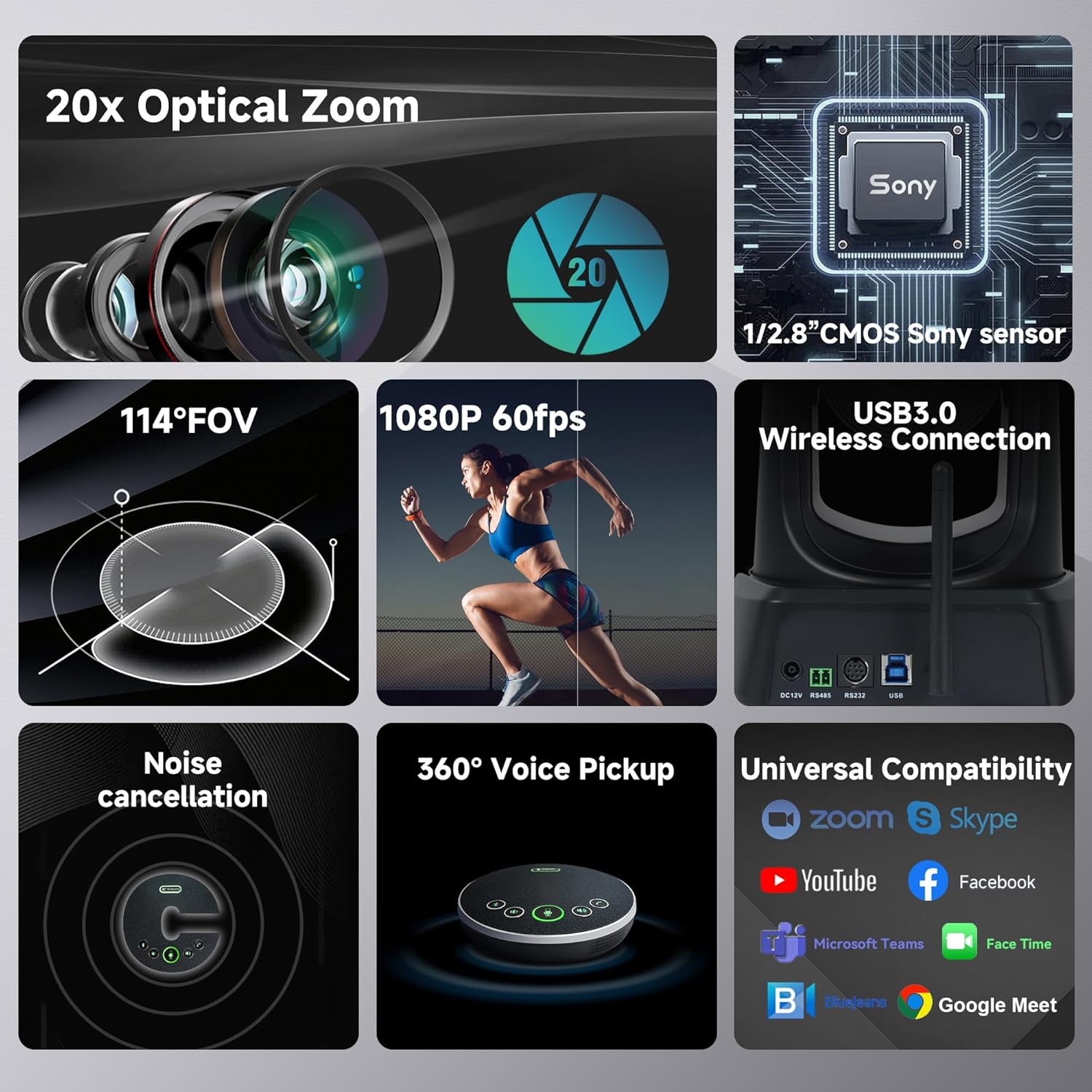 Wireless Conference Room Webcam, Church Live Streaming 20X USB 1080P 60fps PTZ Camera for Worship Services Online Conference, Works with Zoom, Skype OBS Easy to Set Up