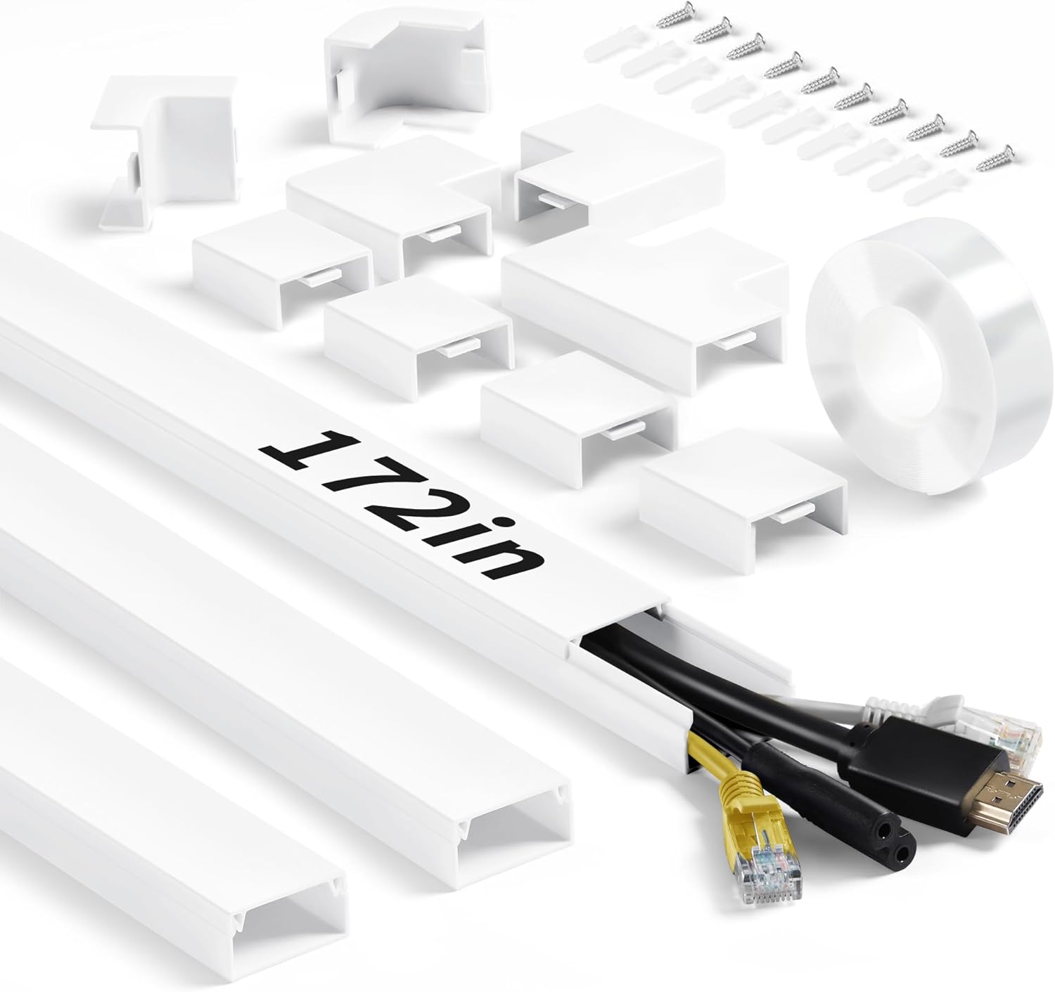 - Includes abundance: Each set contains 11 cable cover, each 15.7-inche long. Comes with 9 connectors: 4 couplings, 2 flat elbows, 1 T-connector, 1 inside elbow, and 1 outside elbow, 28 sets of screws and anchors, and 1 roll of tape(165in).