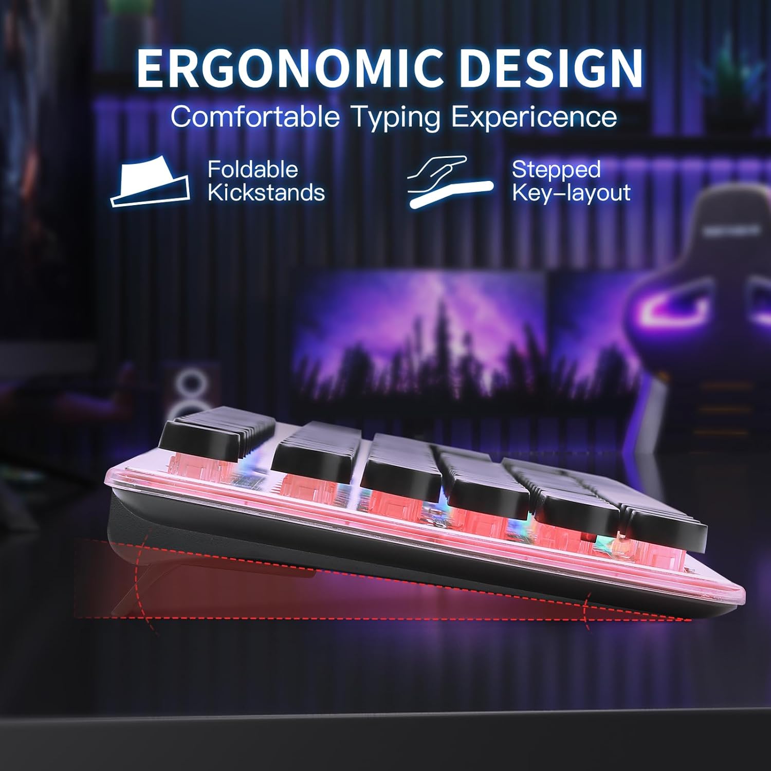 - ❤ 104 Keys Ergonomic Keyboard ❤ Ergonomic design with 2 angle feet on the back of the keyboard, smooth lines, comfortable feeling, and anti-fatigue. 12 multimedia keys combinations, 19 keys non-conflict. 12 combinations of multimedia keys facilitate the operation of your work or game and improve efficiency.