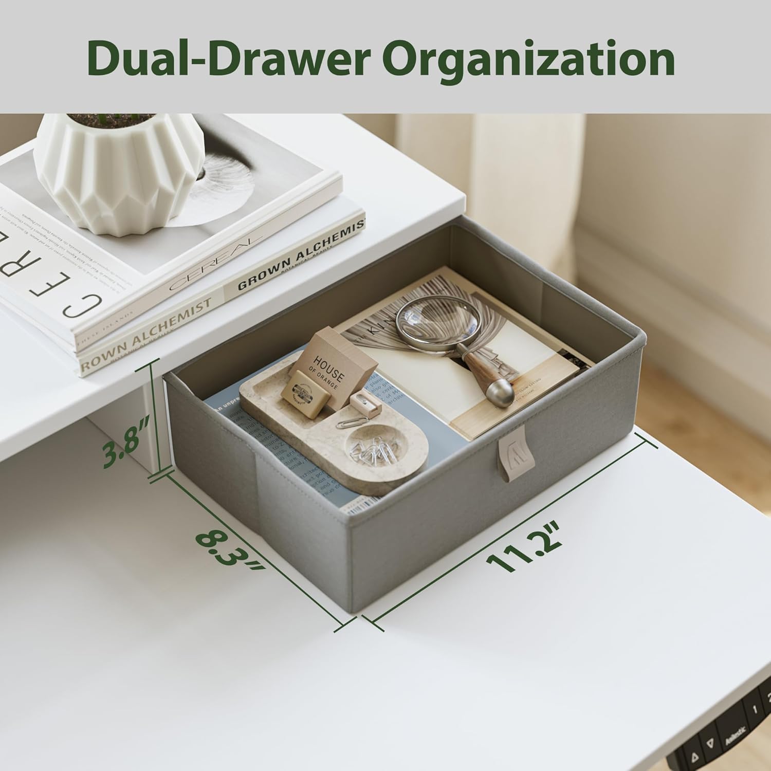 - ăKeyboard Tray & 2 Fabric DrawersăThe 2 fabric drawers above the desktop can organize your clutter and keep the desktop clean and tidy at all times. This stand up desk comes with a slide-out keyboard tray to help you use your keyboard and mouse more ergonomically. The tabletop is made from low-VOC materials and meets federal and state safe air standards.