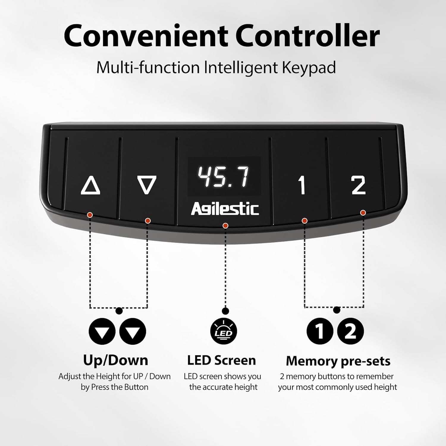 - ăElectric Lifting SystemăAgilestic standing desk has an advanced motor that can support height adjustment between 28.3''-45.7'' with low noise(under 55 dB) while running. You can customize the desired height and record it using 2 memory keys.