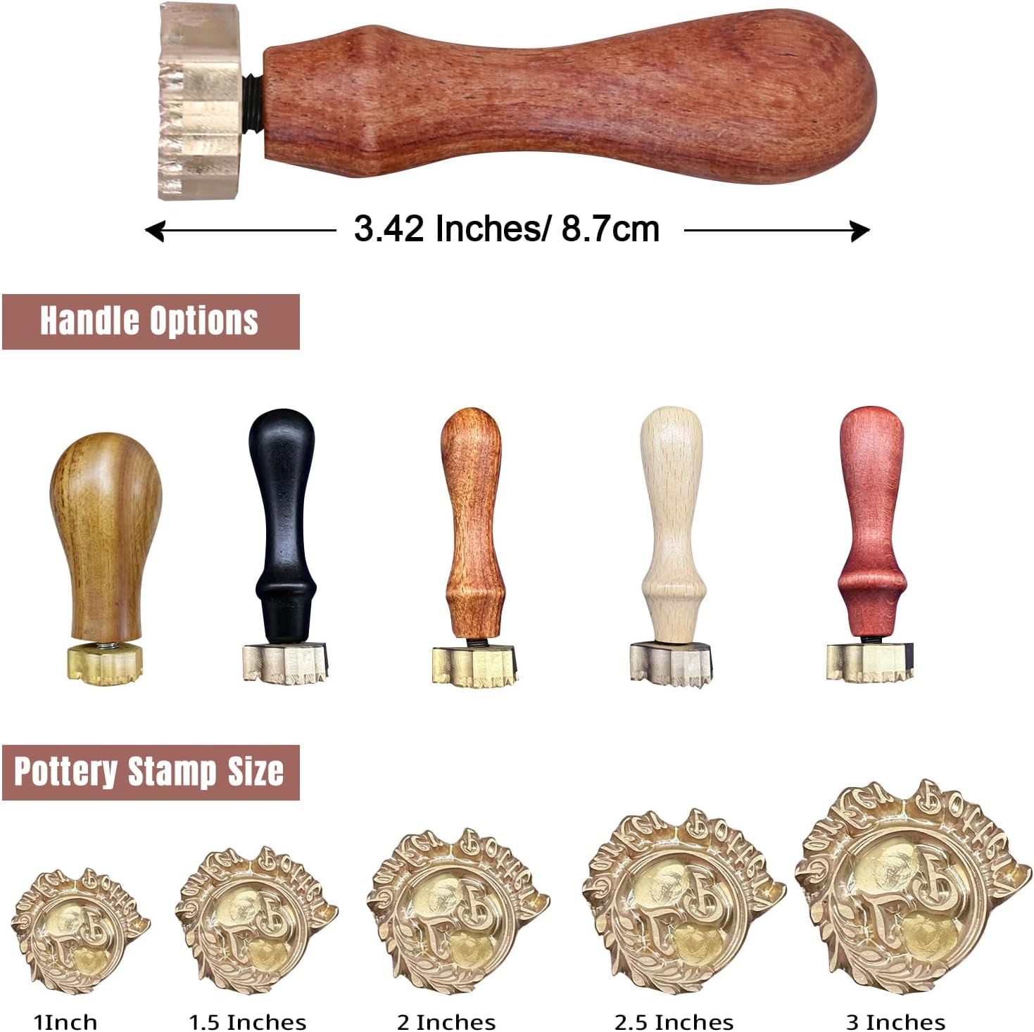 - Size: The wooden handle has an overall length of 3.42 inches. There are five stamp sizes available: 1 inch, 1.5 Inches, 2 Inches, 2.5 Inches, and 3 Inches.