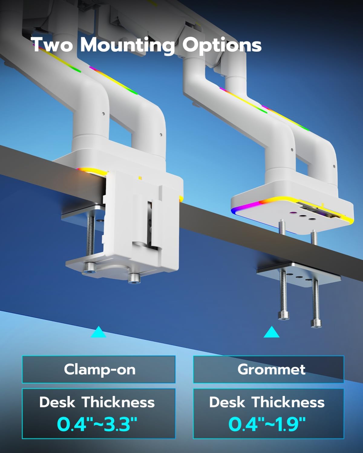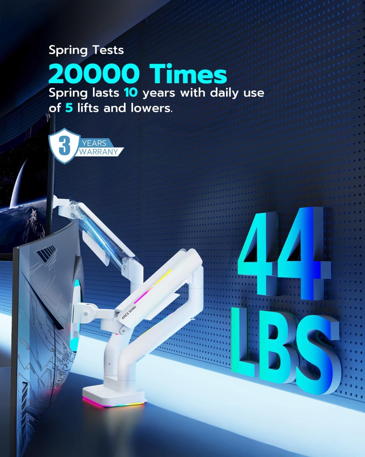 - 【Durable Stability】ARES WING gaming monitor mount, engineered for durability and stability. With a larger base than standard monitors and Industrial grade gas springs tested 20,000 times, it can withstand weights of up to 88lbs (44lbs per arm), ensuring stability and safety even if you accidentally bump your display while watching matches or gaming.