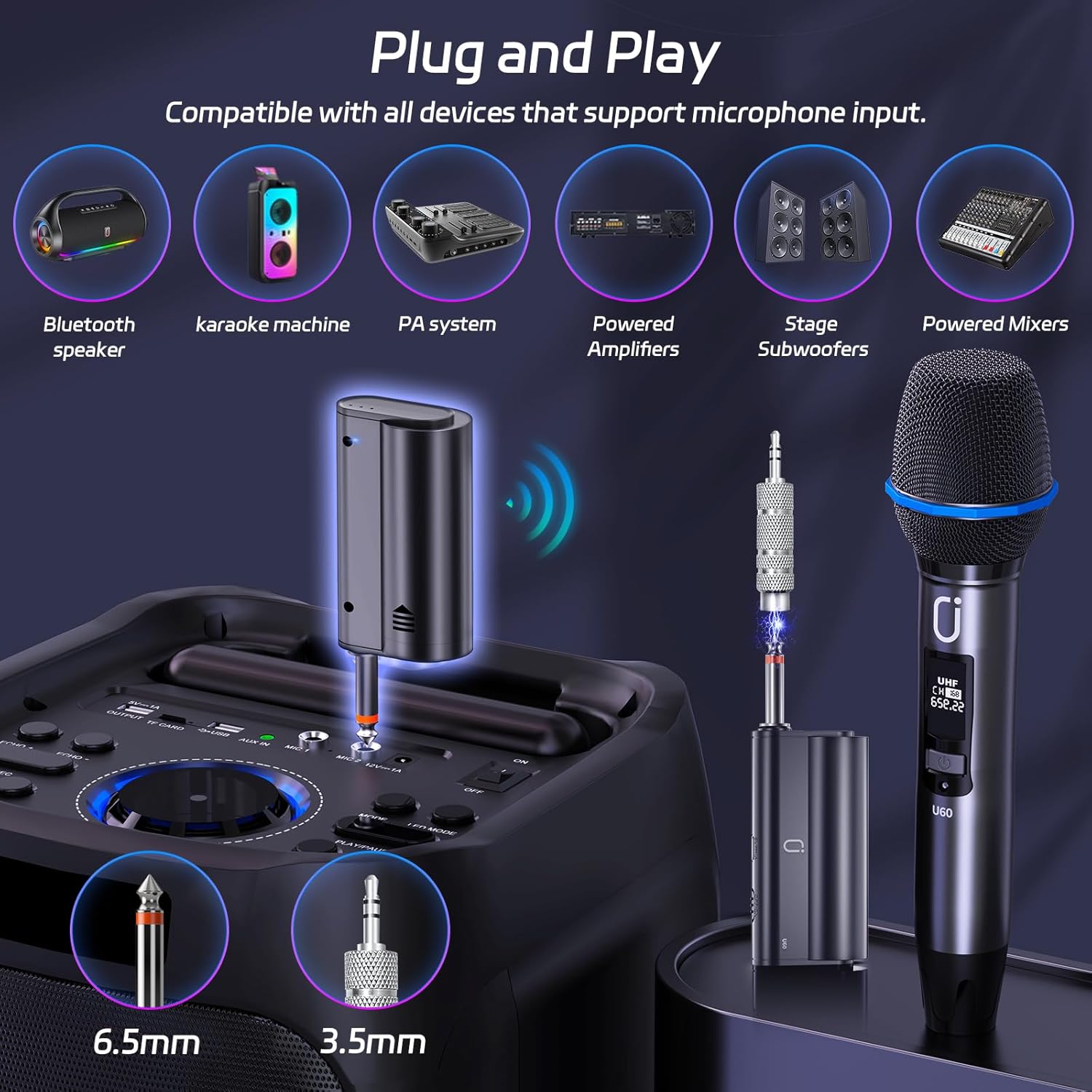 - ăPlug and Play & CompatibilityăSuper easy to use, plug and play! Just turn on the microphone and receiver, and then plug the receiver into the 6.35mm(1/4") / 3.5mm(1/8") jack of the speaker devices, it get started and running. This karaoke microphone with 2 types of mic input for 6.35mm and 3.5mm jack (Only for mic input, not for AUX input), widely compatible with PA systems, Karaoke machine, Audio amplifiers, Mixers, Partybox, Bluetooth Speakers and other multimedia equipment that support Mic input.