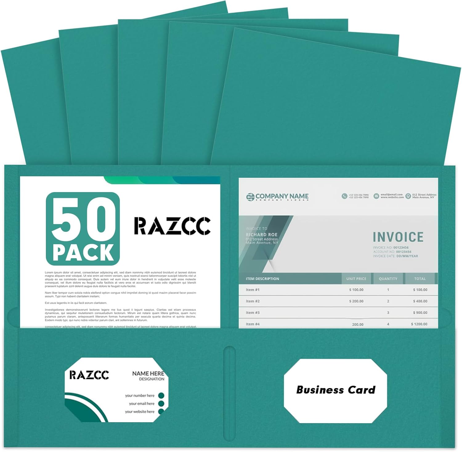 Two Pocket Folders, RAZCC 50 Pack 2 Pocket Folders Fit Letter Size Paper, Paper Folders with Pockets for School Office Business Home, Turquoise