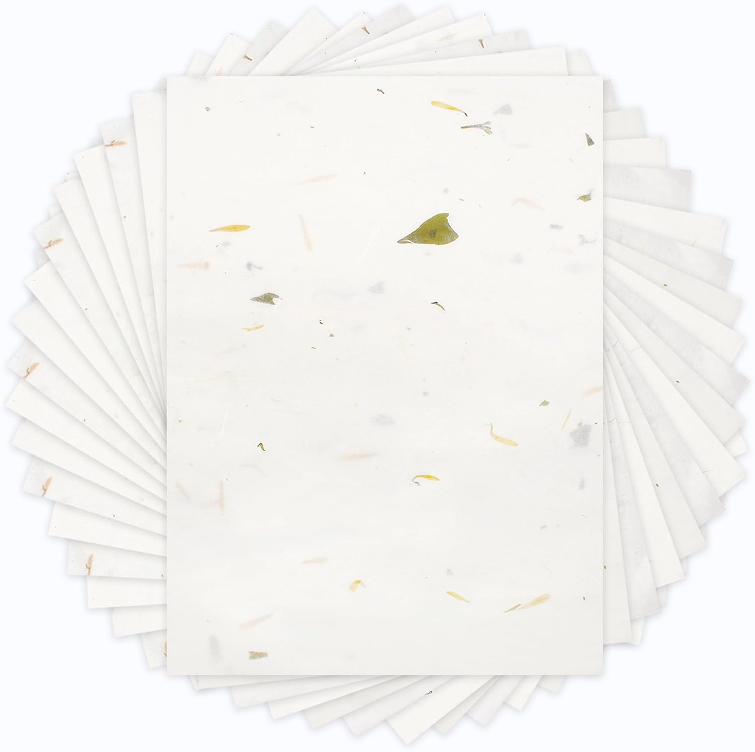 Benvo 50 Sheets A4 Natural Mulberry Paper Visible Leaves Fiber Rice Paper Printable Decoupage Tissue Paper Sheets for Writing, Painting, Card Making, DIY Crafts(8.3x11.7in, Semi Transparent Off White)