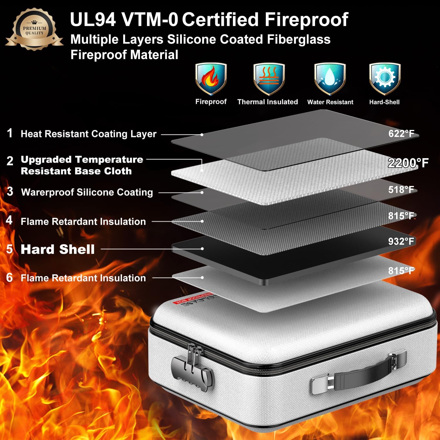 - UL-94 VTM-0 Certified Fireproof Document Safe – COLCASE fireproof document safe box is made of high- quality fire retardant non-itchy silicone coated fiberglass which can stands up against fire and passed the UL-94 VTM-0 Burning Test.