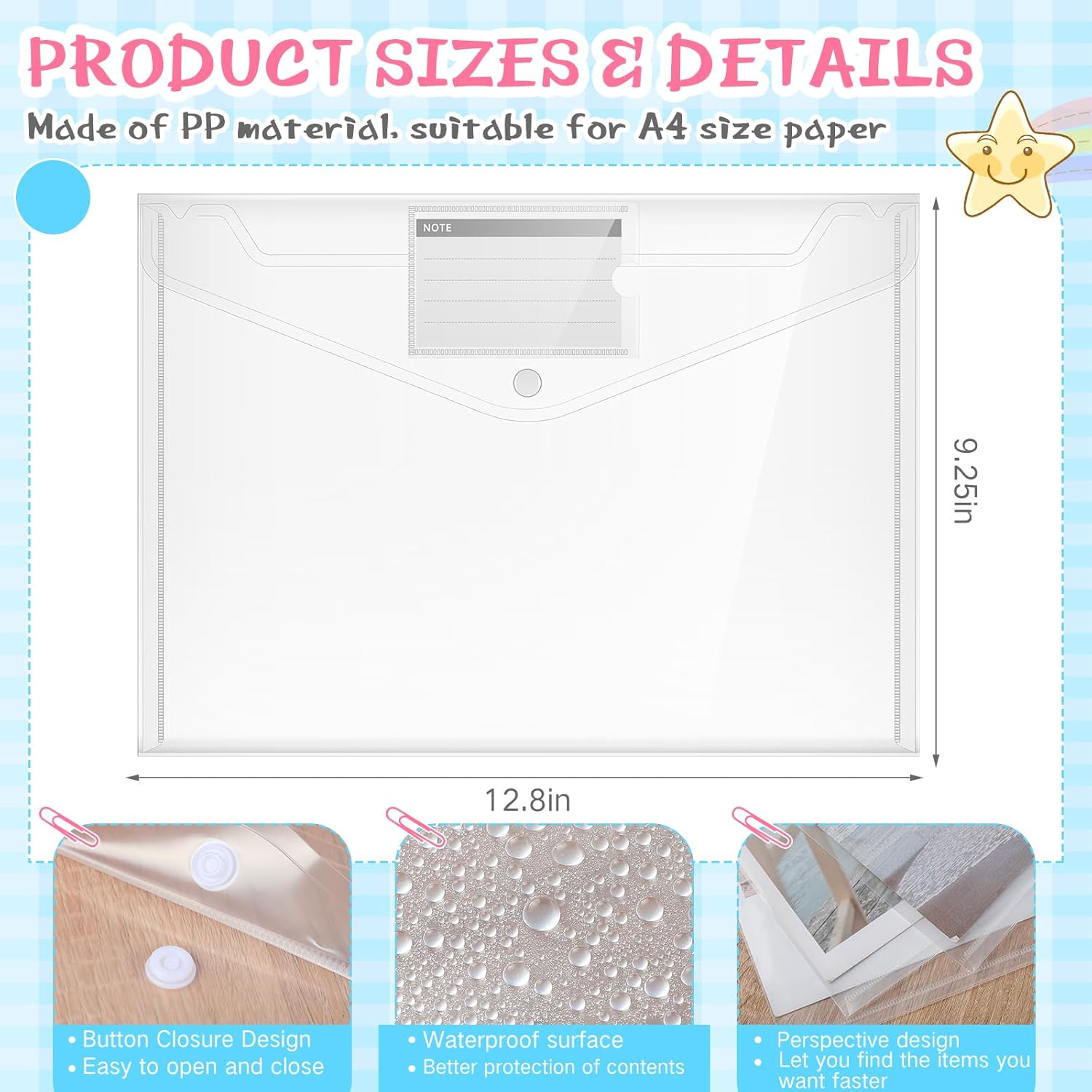 - Product Size: each clear plastic envelope measures about 12.8 x 9.25 inches, suitable for A4 size paper, easy to put documents in and take out, your important documents will not bend or wrinkling, also convenient for you to carry around in your bags without taking up too much space