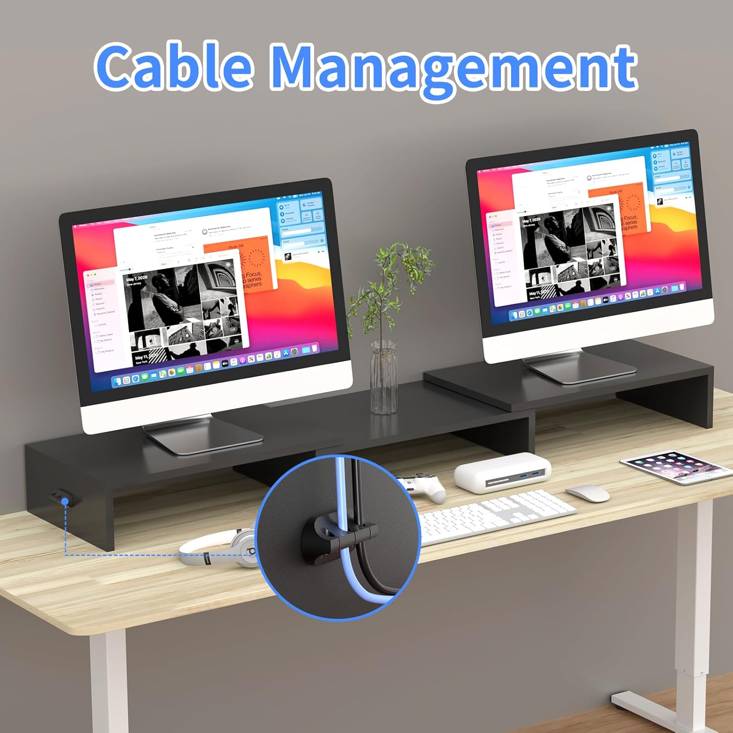 - SPACIOUS STORAGE UNDERNEATH - It elevates the monitors to comfortable viewing height up to 104mm, creates an additional large storage, allowing you to put your keyboard, mouse, DVD players, cell phones, iPad, tablets, sticky notes, business cards, and other desk accessories under the shelves, makes your workplace instantly spacious and tidy.