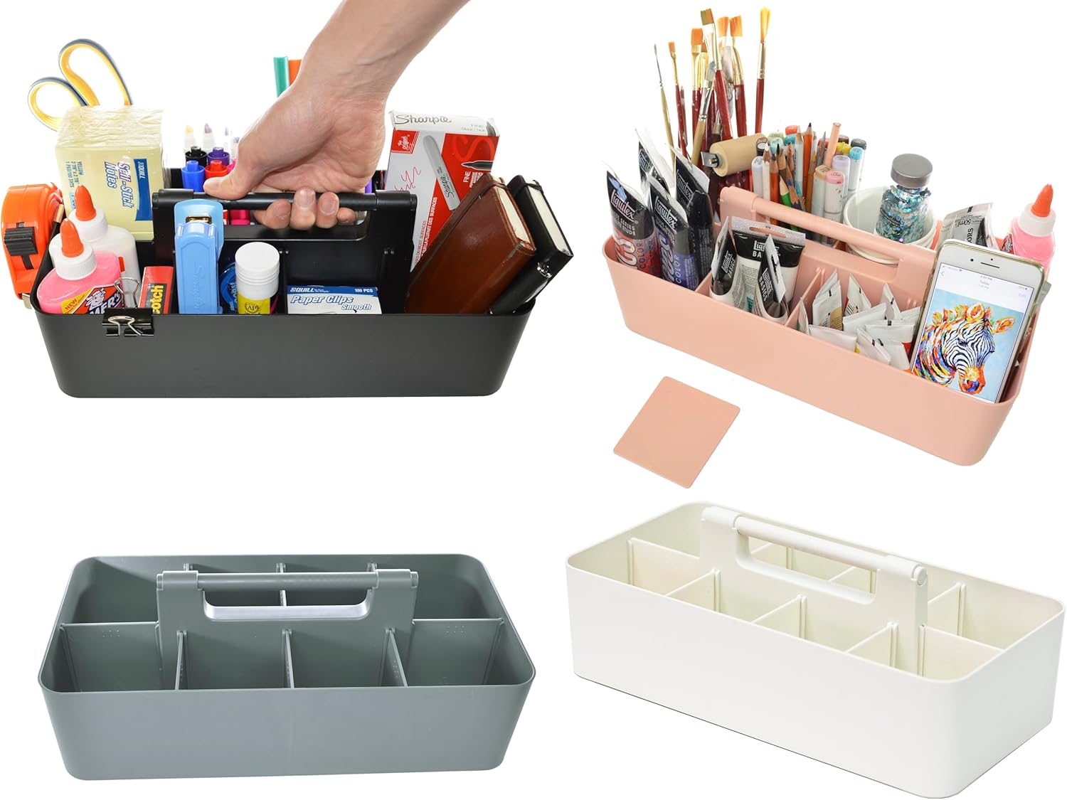 - PORTABLE: Equipped with an easy-carry round smooth handle, this caddy makes transporting goods from shelf to cabinet or desktop a breeze. Just grab and go! The open tops and divided compartments make it easy to see what’s inside and quickly grab what you need. Use these convenient storage caddies to keep office desk items organized, children's crafting items tidy, and school supplies in check. Perfect for both home and commercial workspaces.