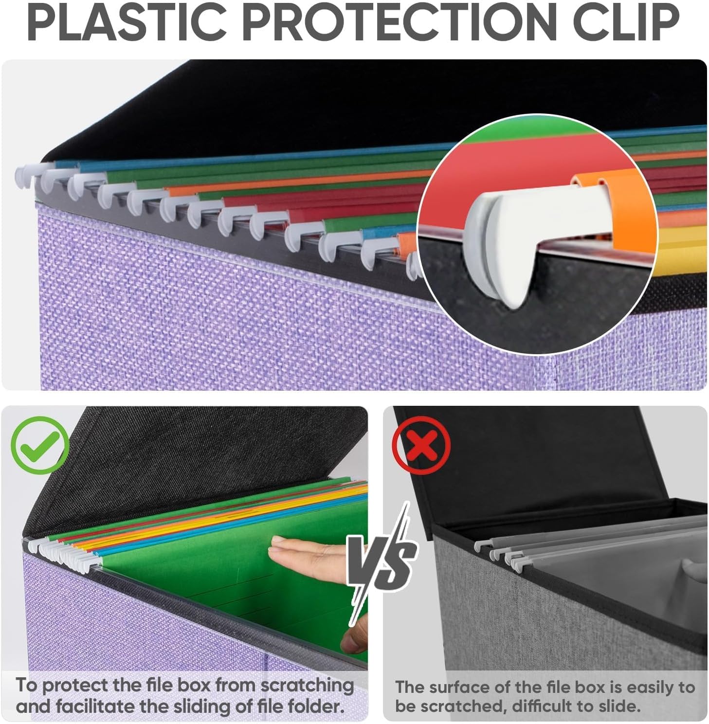 - [UNIVERSAL SIZE] Our file box with lid fits letter-sized files. It is designed for efficiency and functionality, with its smooth PVC slide rails on both sides, you can effortlessly slide file folders for easy access and neatly arranged. The lid fits snugly on the box after hanging folders. (NOTE: file folders are not included)