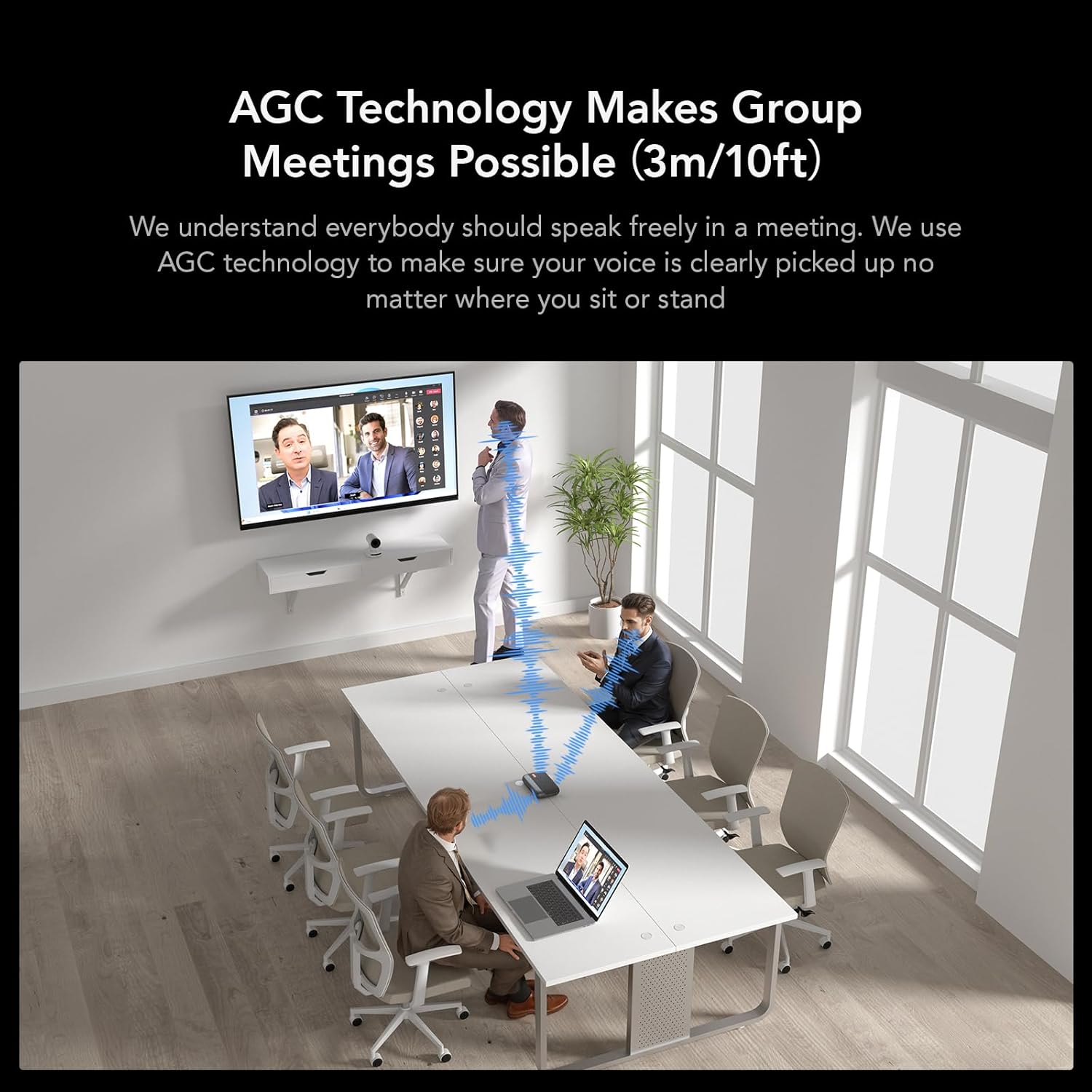 - Full Duplex & Automatic Gain Control: Allows multiple people to speak simultaneously without missing any part of the conversation, thanks to full duplex audio processing. AGC technology can help automatically adjust the volume of the voices within 3m/10ft so that the participants can still hear a clear volume level when the distances are different and the volume of participants is different, ensuring the quality of the meeting.