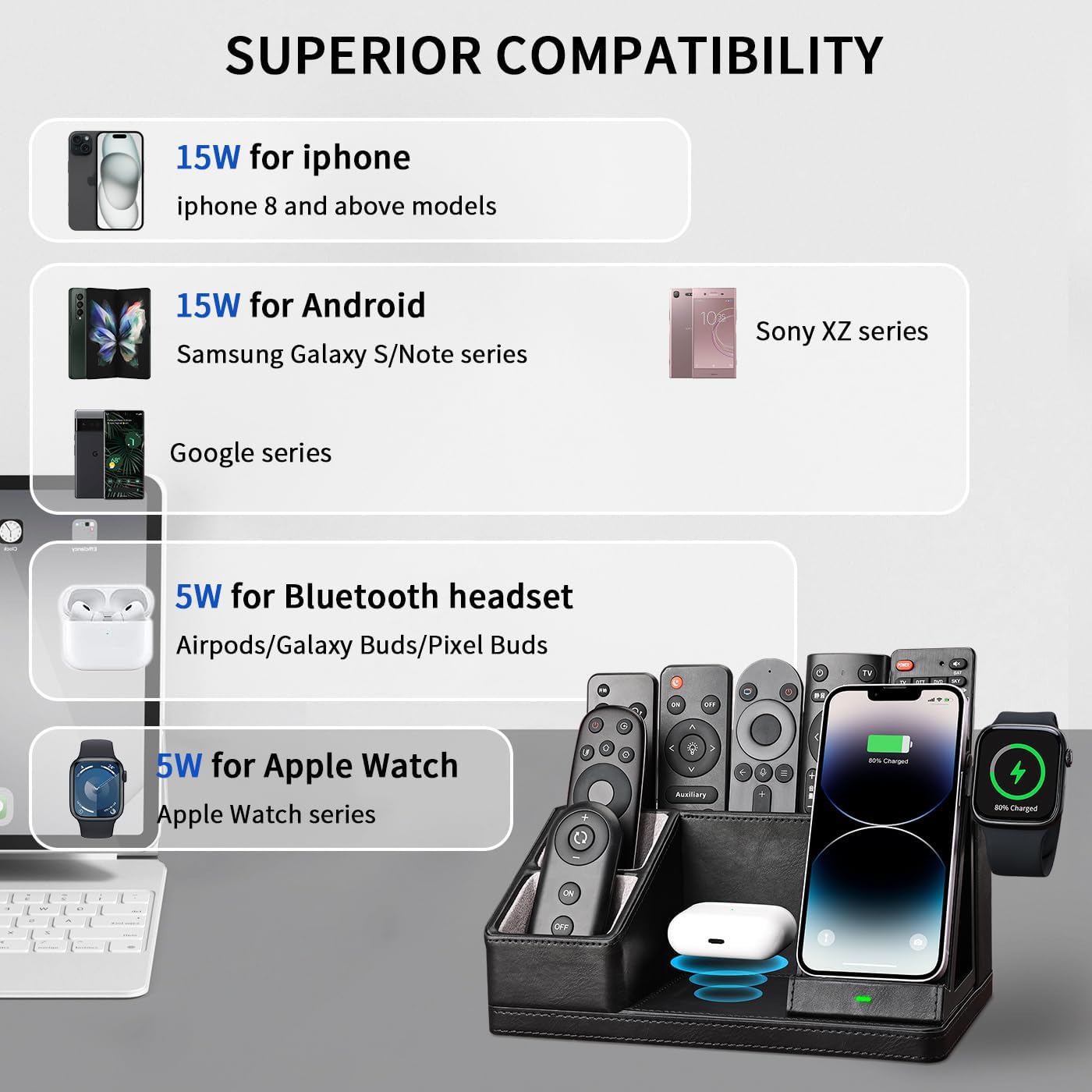 - â¶ăMulti-Functional Organizer with Charging Stationă: This all-in-one desk organizer with wireless charging station, with dedicated spots made for your iPhone/Apple Watch/AirPods charging at the same time; and keeping your pens, remote control, glasses, and other daily-used small things. Say goodbye to tangled cords and enjoy wireless charging by simply laying your device on the charging stand, no more plug-in/ out troubles.