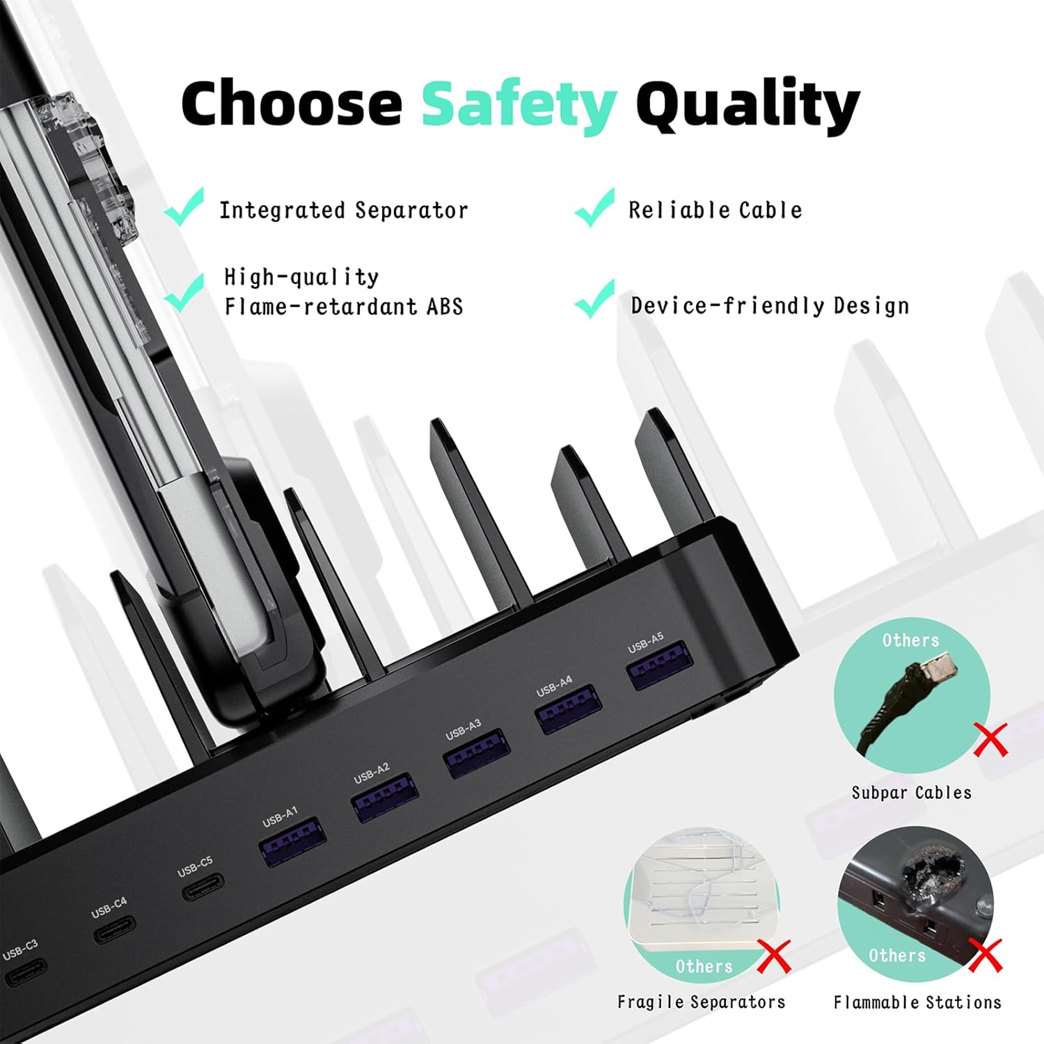 - Sturdy One-Piece Slots: Unlike other charging stations that use fragile, removable dividers, our multi-port charging station features a durability design made from high-quality, flame-retardant ABS material, ensuring a longer lifespan. We’ve specially designed two extra-wider and taller slots in the middle, each measuring 1.57" wide and 1.77" high. These slots are perfect for securely holding a laptop or a child's iPad with a protective case intact.
