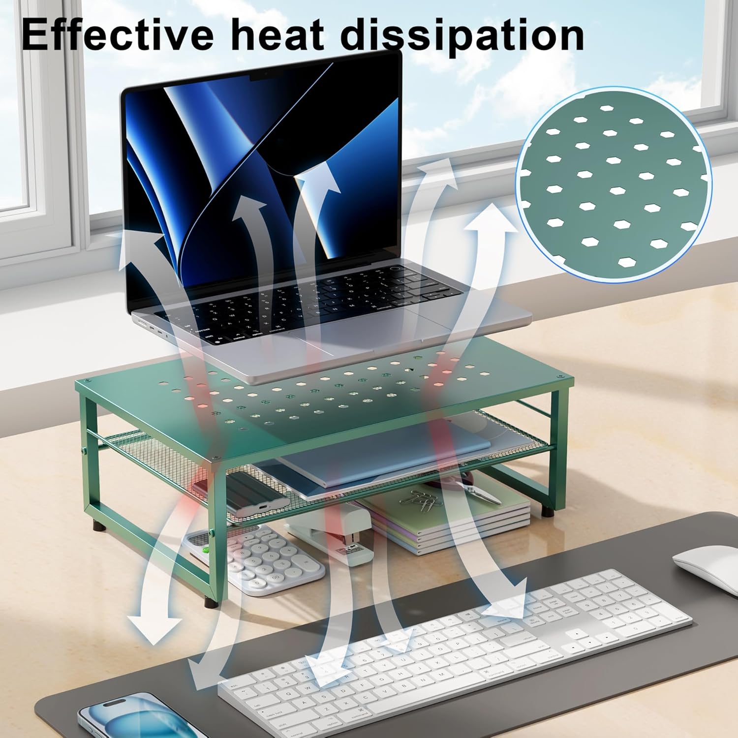 - 【Practical and Stylish】 The laptop stand has a simple yet sophisticated dual-layer design, providing ample space to store various office supplies, keeping your desk tidy. This allows you to work more efficiently in a comfortable and organized environment.