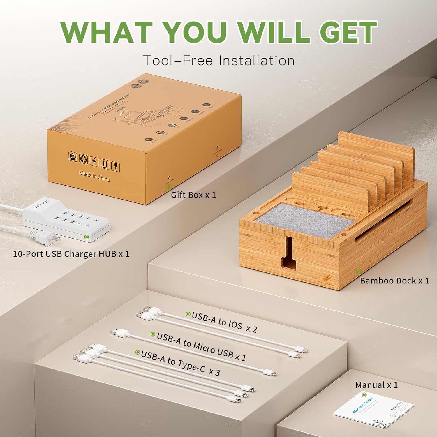 - What You Can Get: 1 x Pezin & Hulin Bamboo Charging Station, 1 x 10-Port USB Charger HUB & Cord, 6 x Short USB Cables (3pc Type-C, 2pc for lPhone & lPad, 1pc Android) for your daily use, 1 x user manual
