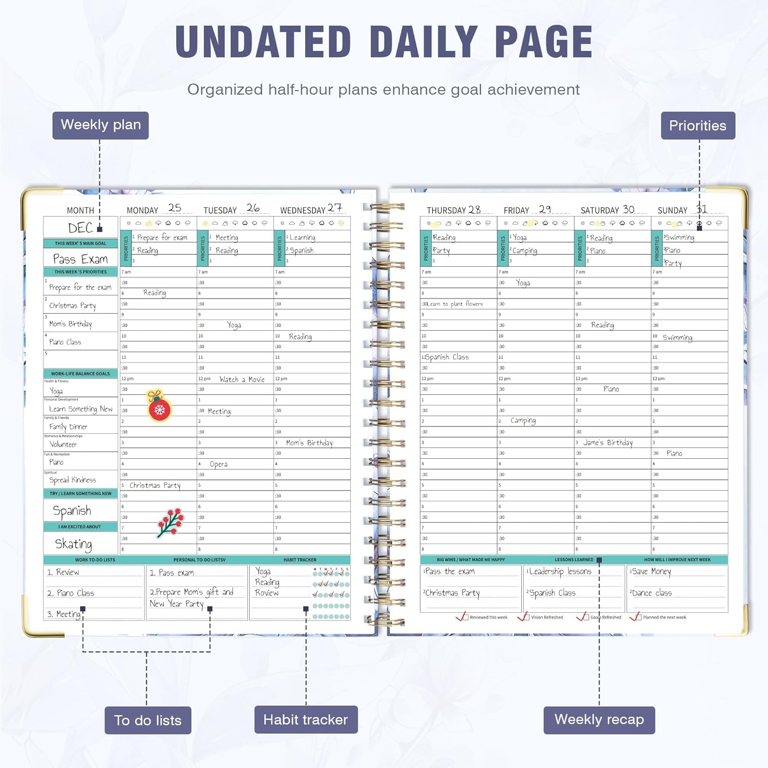 - Boost Your Productivity: Additional accessories included: instructions, bookmarks, stickers, and labels. Whether for work, study, or personal use, undated planner is the perfect tool for achieving your daily priorities and taking control of your schedule.