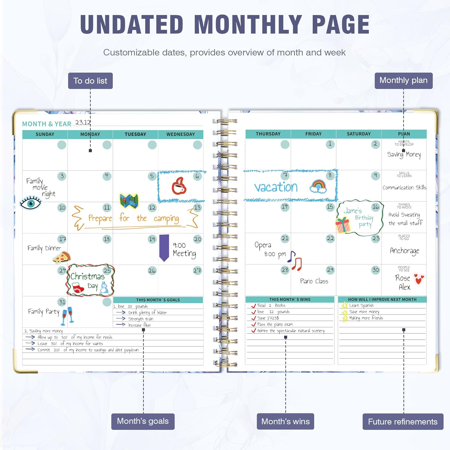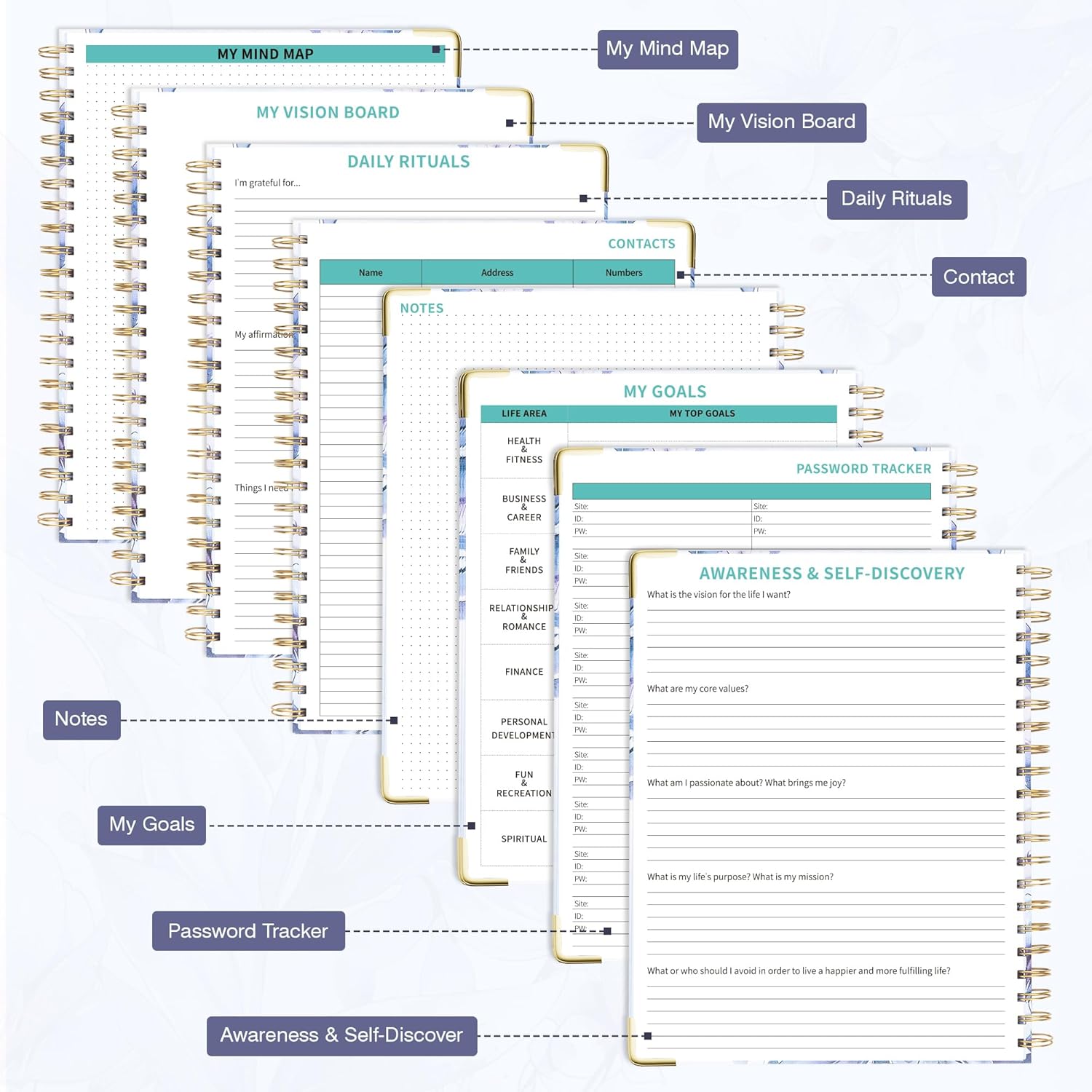 - Undated Clear Layout: With 12 blank months and 53 weeks, a 7 AM to 8 PM daily schedule section, and additional sections for contacts, passwords, awareness and self-discovery, daily rituals, goals, and notes, this life planner offers the freedom to plan your schedules at any time.